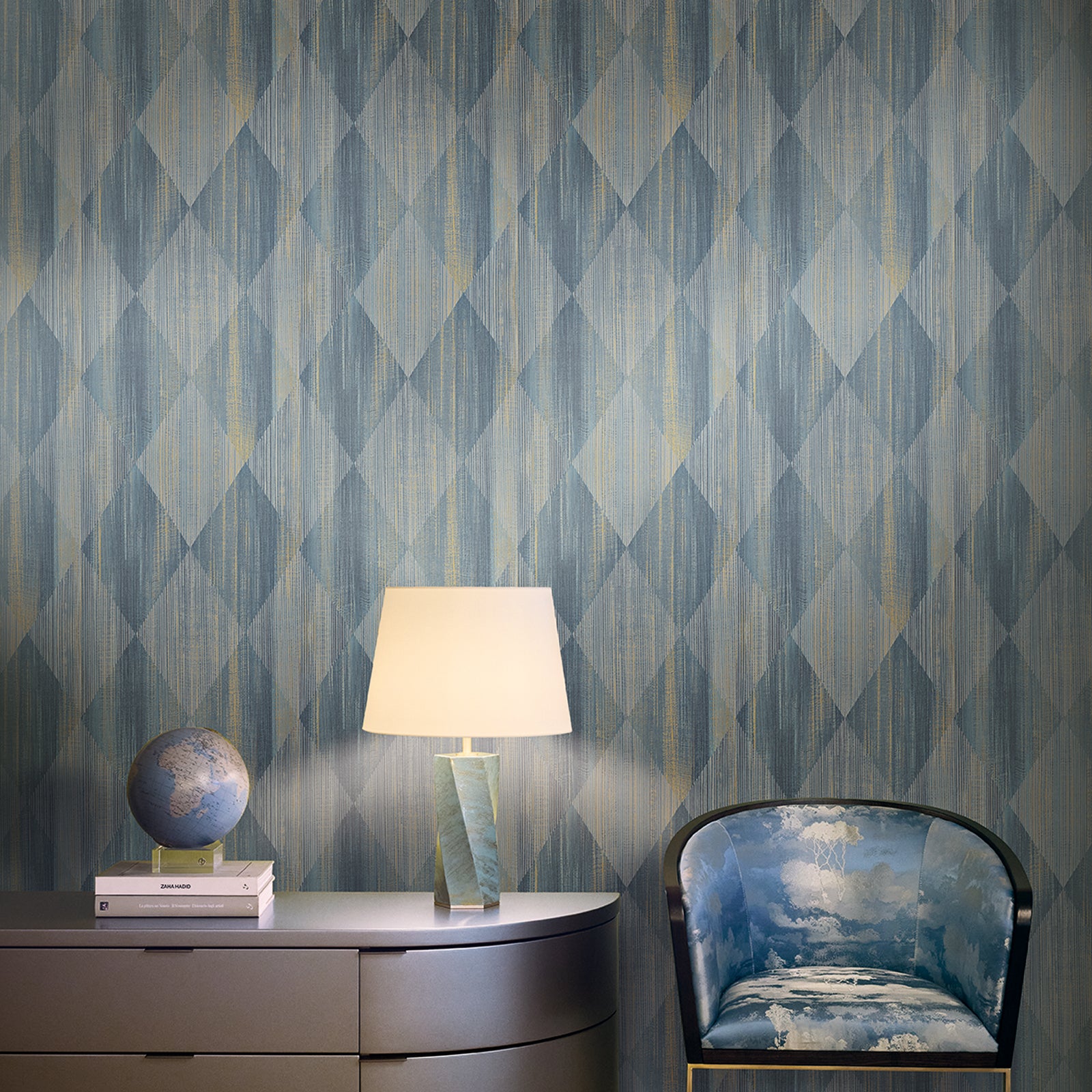 Armani Casa Hokkaido Wallpaper features bold, macro-scale rhombuses as its central design, created with a print of metallic silver gauze on a non-woven base. The striking geometric pattern draws inspiration from fashion, referencing the Giorgio Armani Privé Spring-Summer 2023 haute couture collection. This connection to the world of textiles is further highlighted by the three-dimensional vertical lines on the non-woven support, which evoke the texture of fabric threads and yarns. The design also incorporates selective transparency in specific areas, enhancing the metallic foil’s visibility and making it more reflective, adding an extra touch of sophistication and light play.