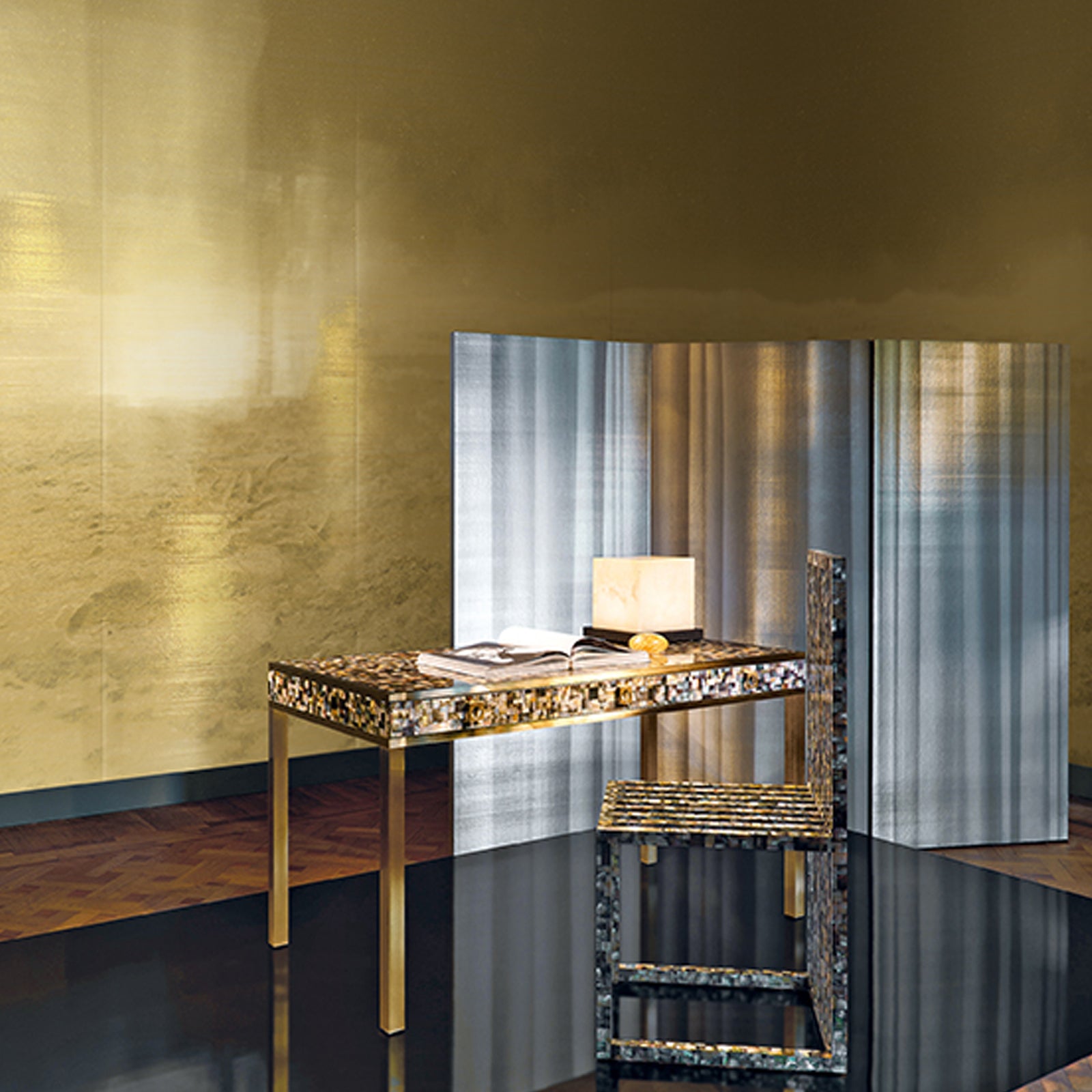 A lunar landscape is interpreted with preciousness through golden shades on shantung silk and metallic fibers. The subject appears entirely enveloped by light, acquiring a fairytale and oneiric dimension recalling lyrics by the Italian poet Giacomo Leopardi (1798-1837) dedicated to the moon.