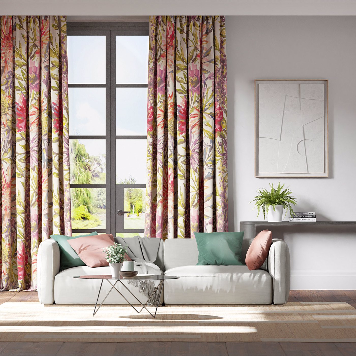 Fauvisimo - Floreale. A vivacious floral fabric design digitally printed with overblown peonies, foxgloves and foliage. Its large scale lends itself particularly well to curtains and blinds.