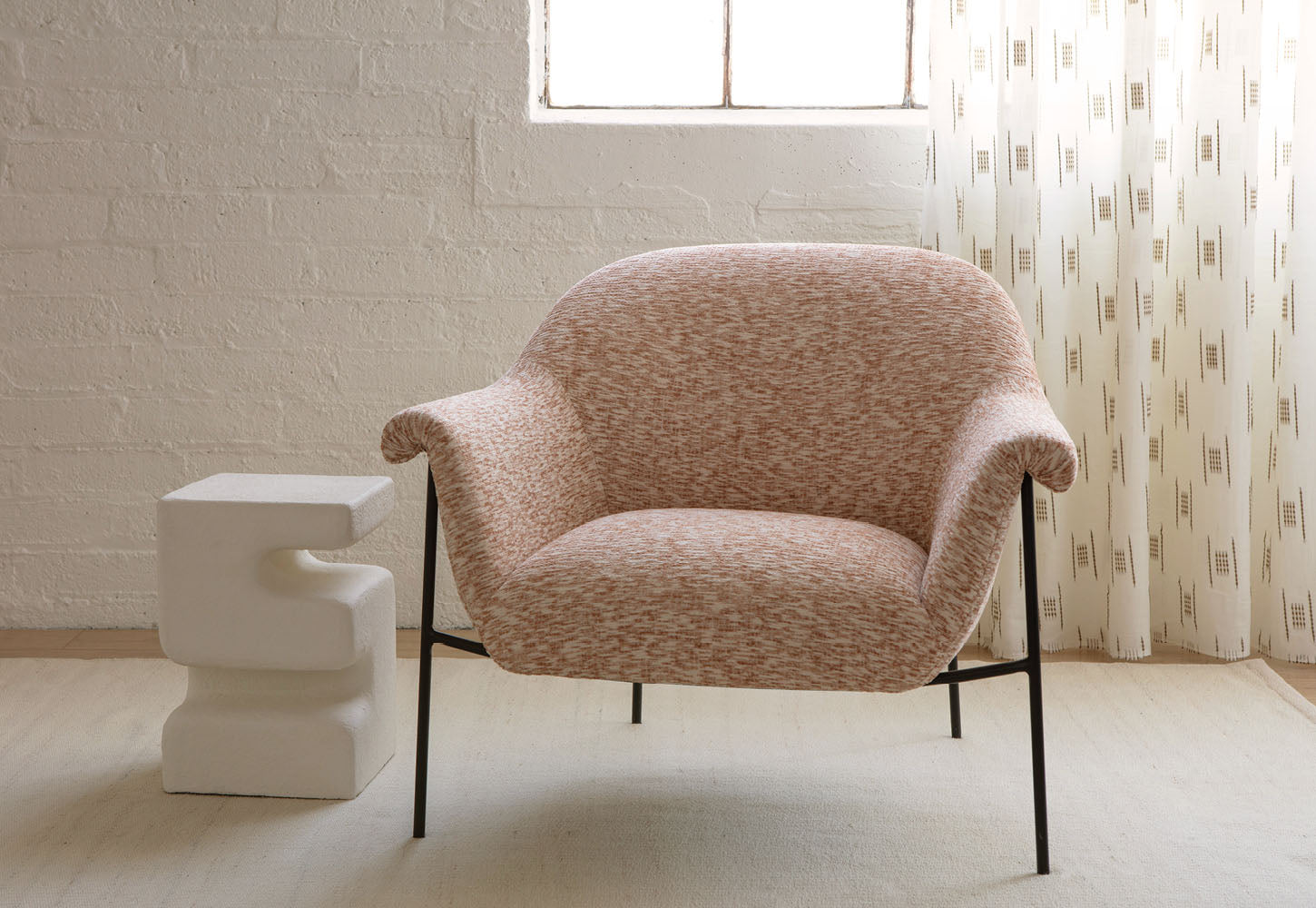 Spindrift’s beautiful, feathery appearance comes from its yarns, which are printed with random dashes of color before being woven. The yarns are intermittently cinched tighter in certain areas, allowing them to puff up on the face for a tactile element.