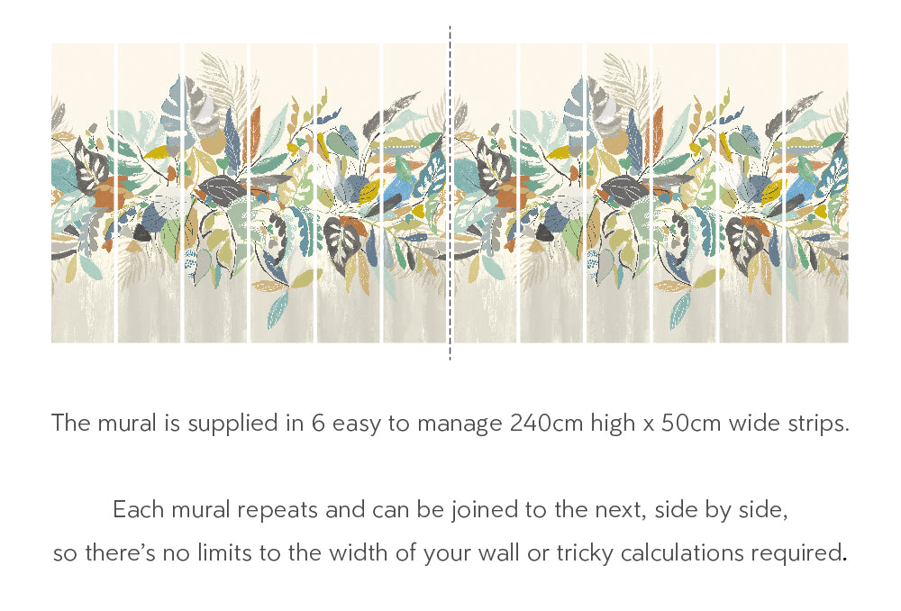 A vibrant interpretation of stylised leaves and ferns combine to create a Joseph’s Coat of colour. Hand-drawn in paint and ink, the design showcases a variety of techniques, emanating a positivity and lovely fluid movement that layers across the wall.