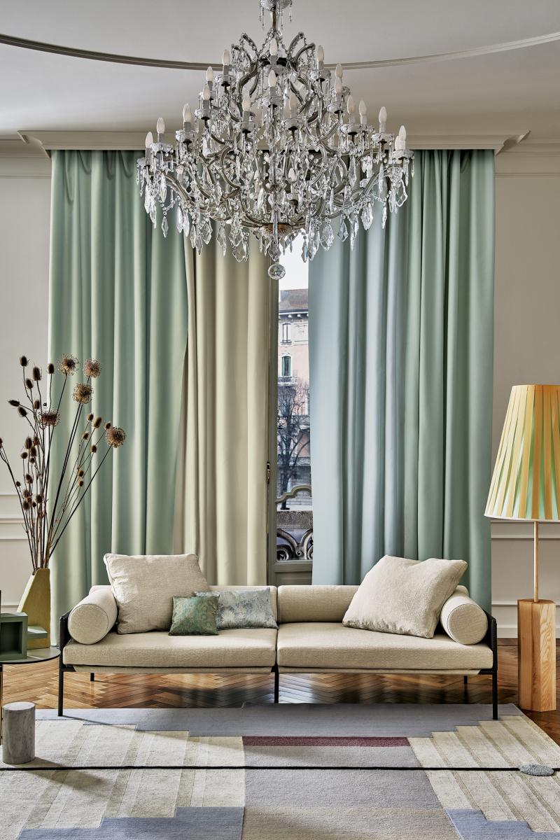Flame retardant curtain in Trevira CS, in double width. Made with very fine yarns, with silk hand and appearance. The palette is very refined - 16 delicate shades, with a predominance of pastels.