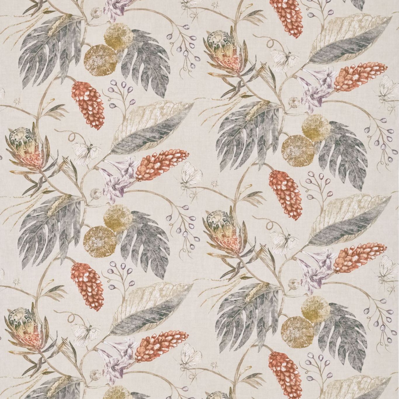 A botanical vintage light-upholstery fabric in organic colourways featuring delicately drawn butterflies pinecones and exotic flowers.