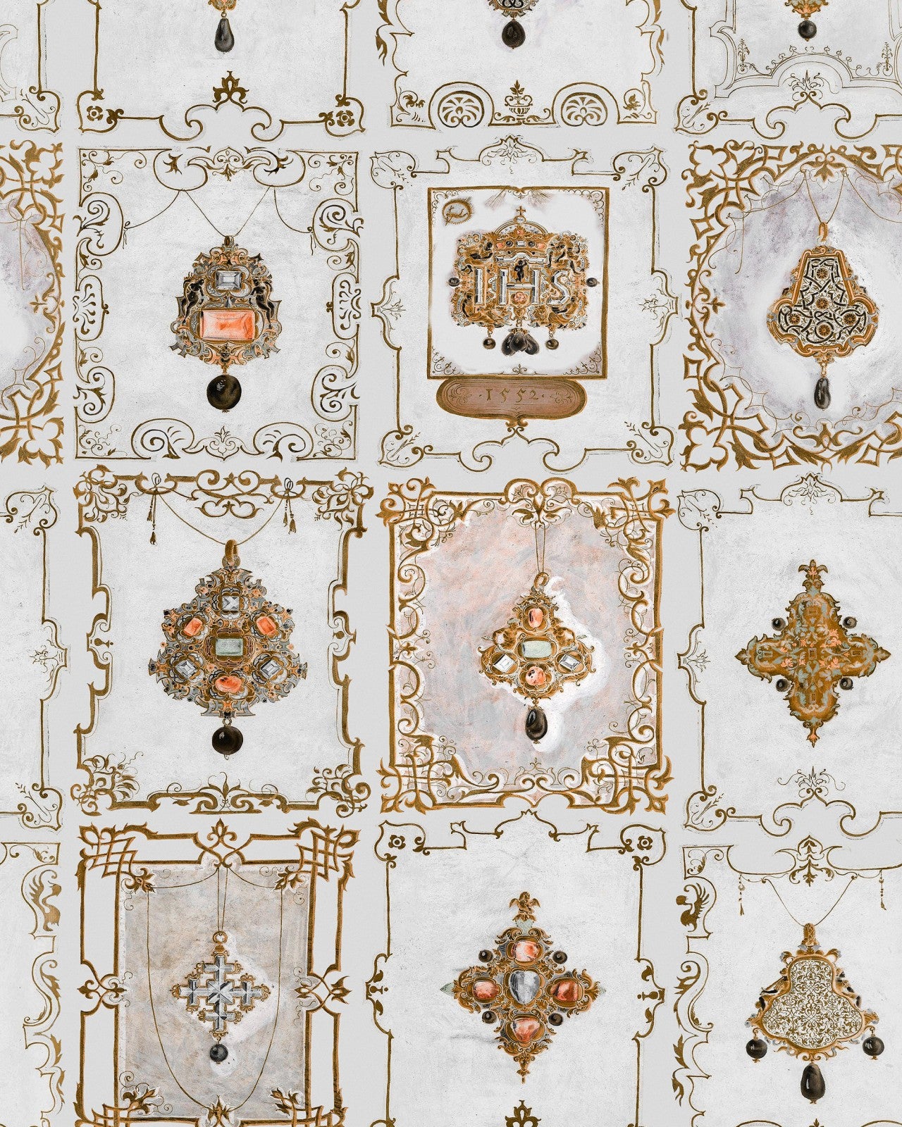 A collection of antique jewerly, on a black background, inspired from the unique manuscript "Jewel Book of the Duchess Anna of Bavaria". This timeless design will transpose you into a different state of mind.