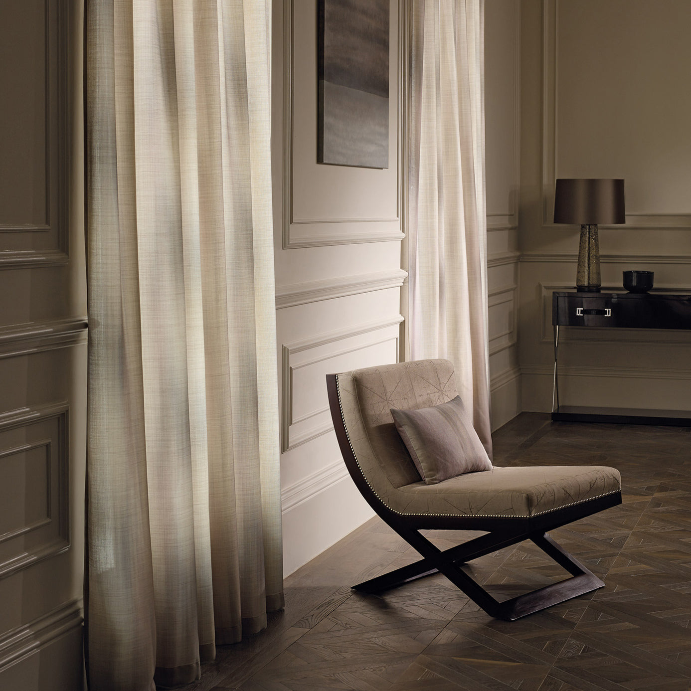 Reminiscent of a cascading waterfall, this complex ombré stripe in moody colourways is digitally printed to retain the soft vertical movement and twists of colour of the original artwork. The herringbone construction of this wide width cloth combines slightly metallic yarns with linen to evoke the sense of reflection and is suitable for blinds, cushions and curtains. A wallpaper of the same name is also available.