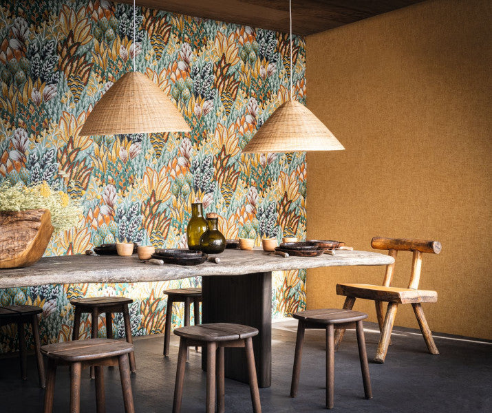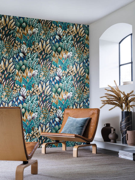 Lush vegetation adorned with rich colours comes to life on the walls. The rich colours are created using the rotogravure technique which produces very precise patterns. Avicennia coordinates with the “Kirsten garden” fabric. Also called the black mangrove, the Avicennia is a small tree found in tropical mangroves.