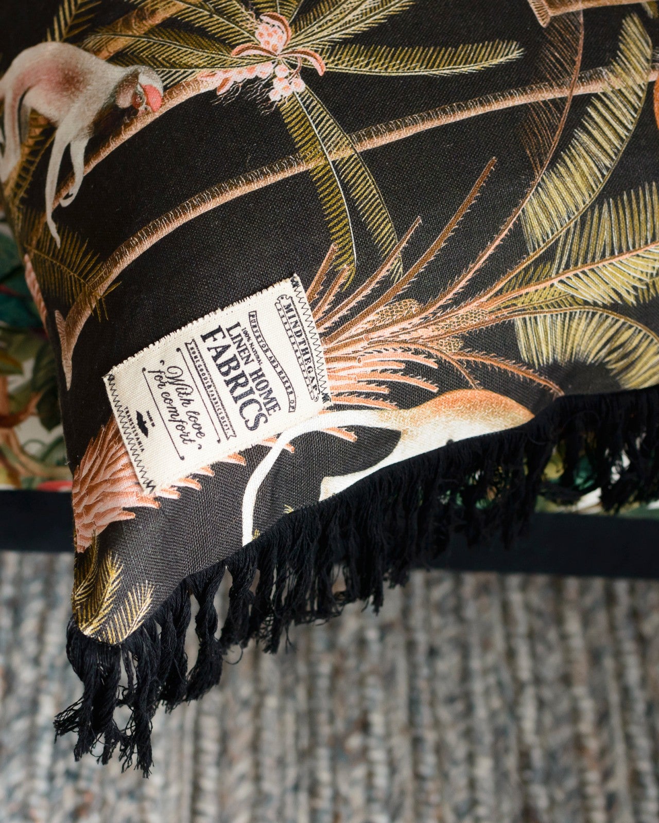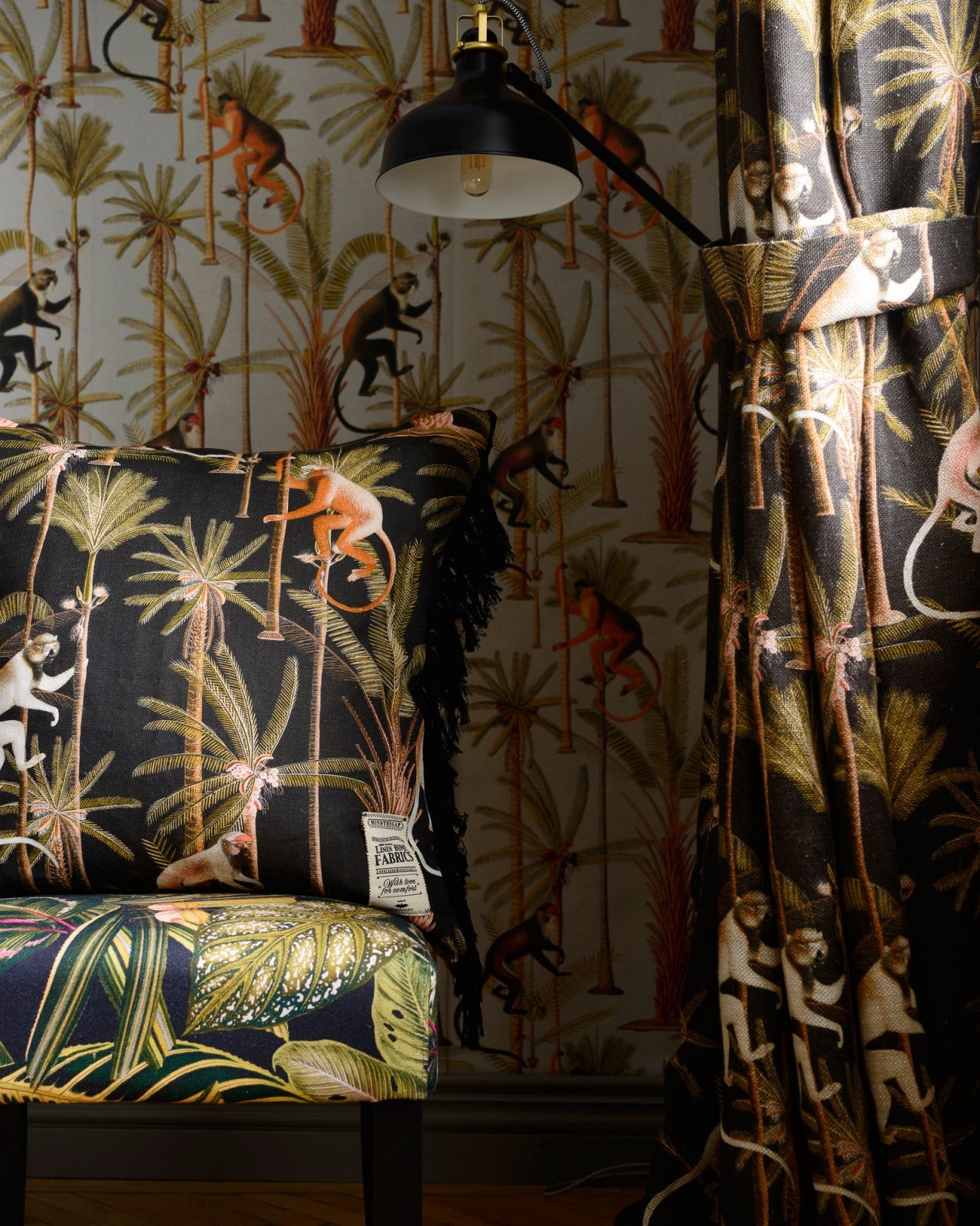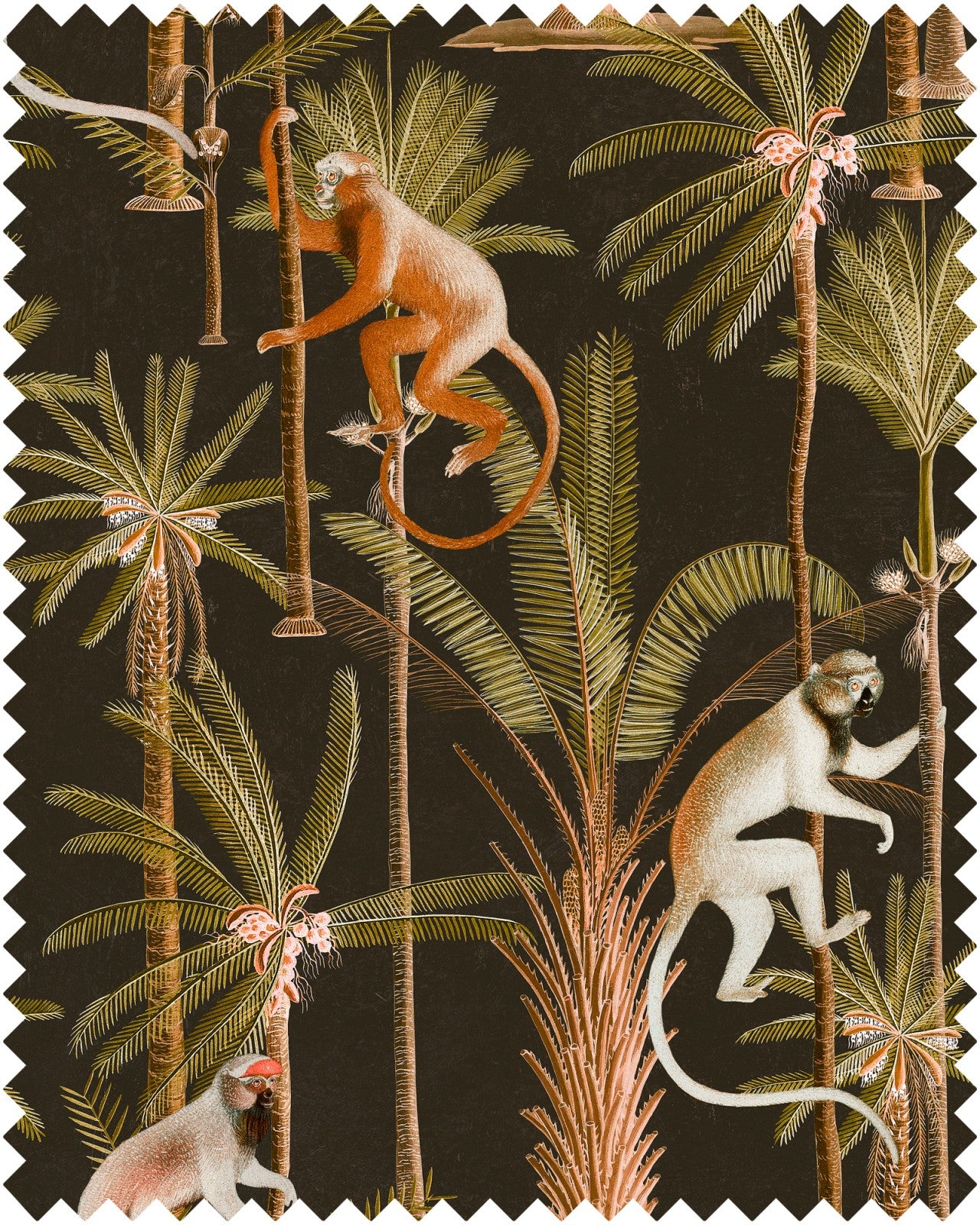 A tropical style design featuring impressive palm tree and various monkey illustrations on black background.