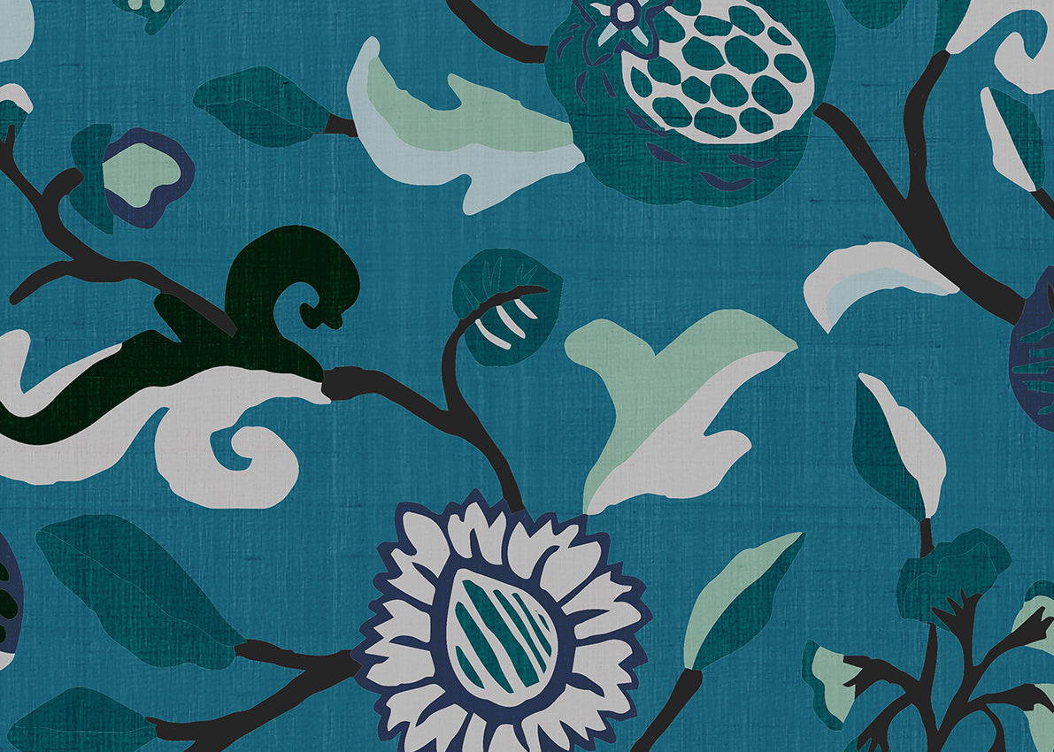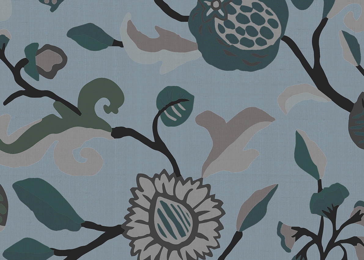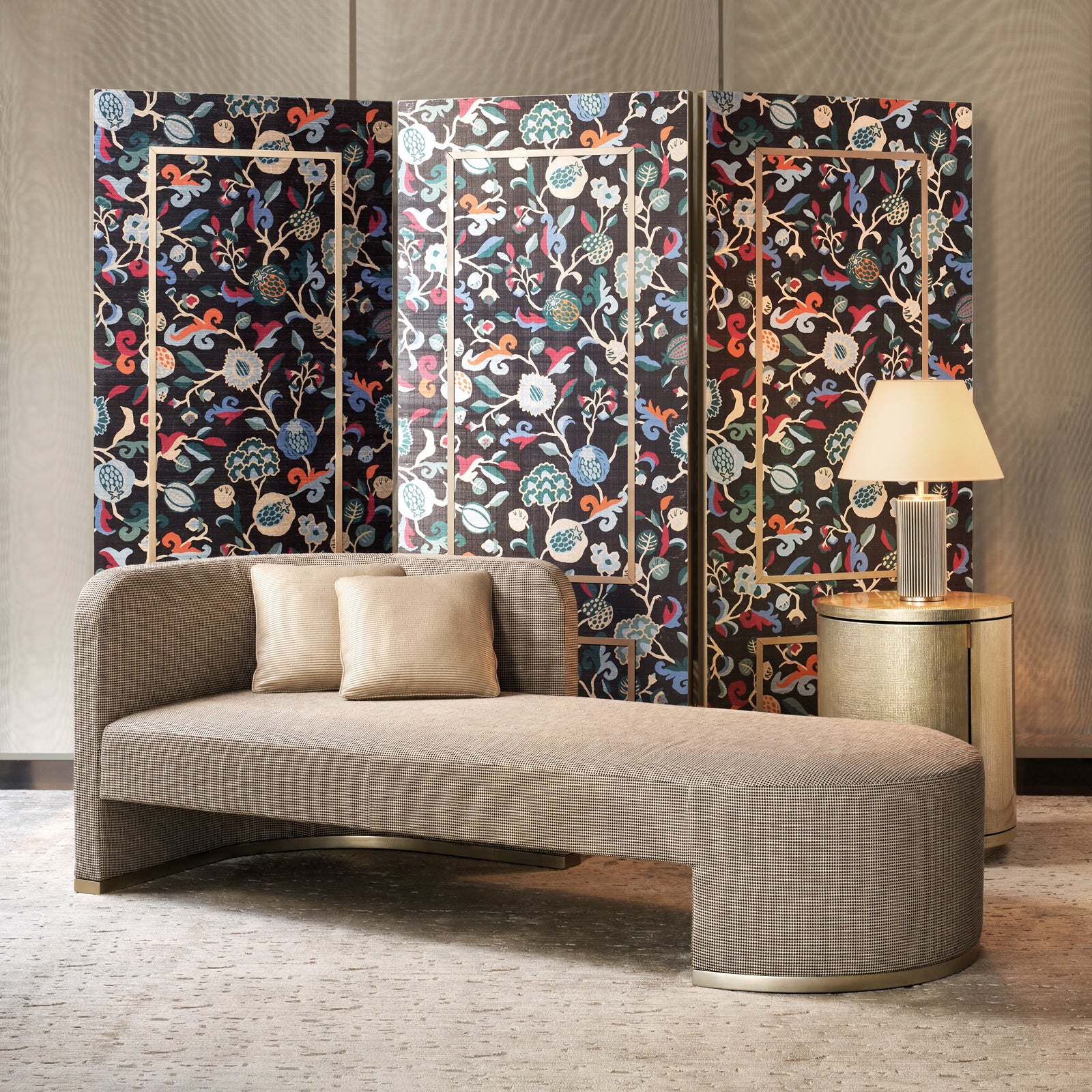Typical patterns of the folklore are reinterpreted with a contemporary look, with branches and pomegranates printed on a precious Indian silk. The sharp edges and the contrasting colours define shapes and highlight the liveliness of the design. The exotic atmosphere of the décor echoes the famous ballet by Marius Petipa La Bayadère (1877), which narrates the story of a young Indian dancer.