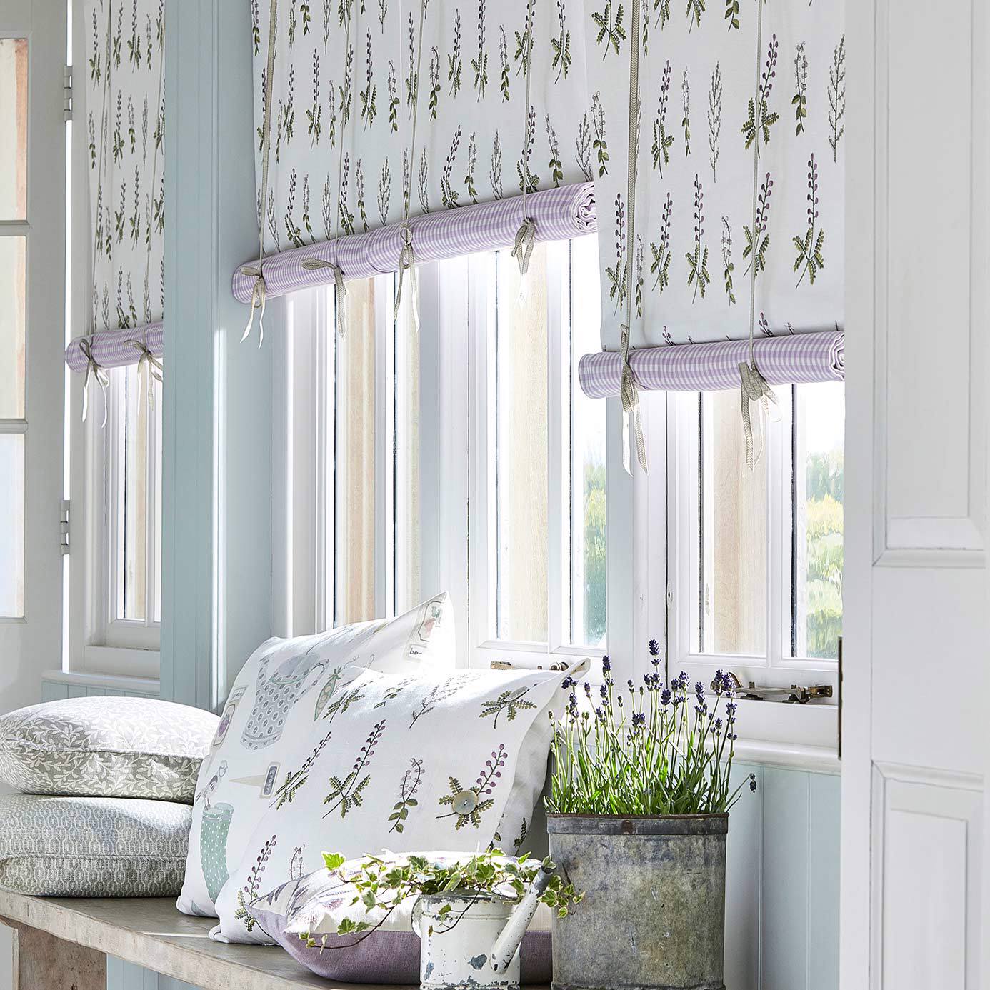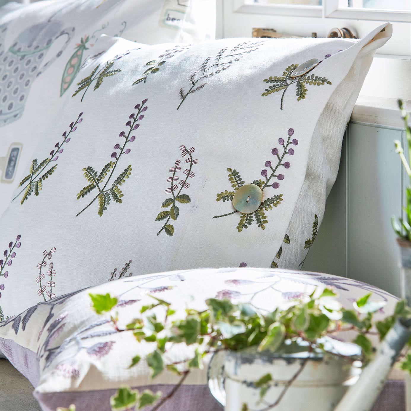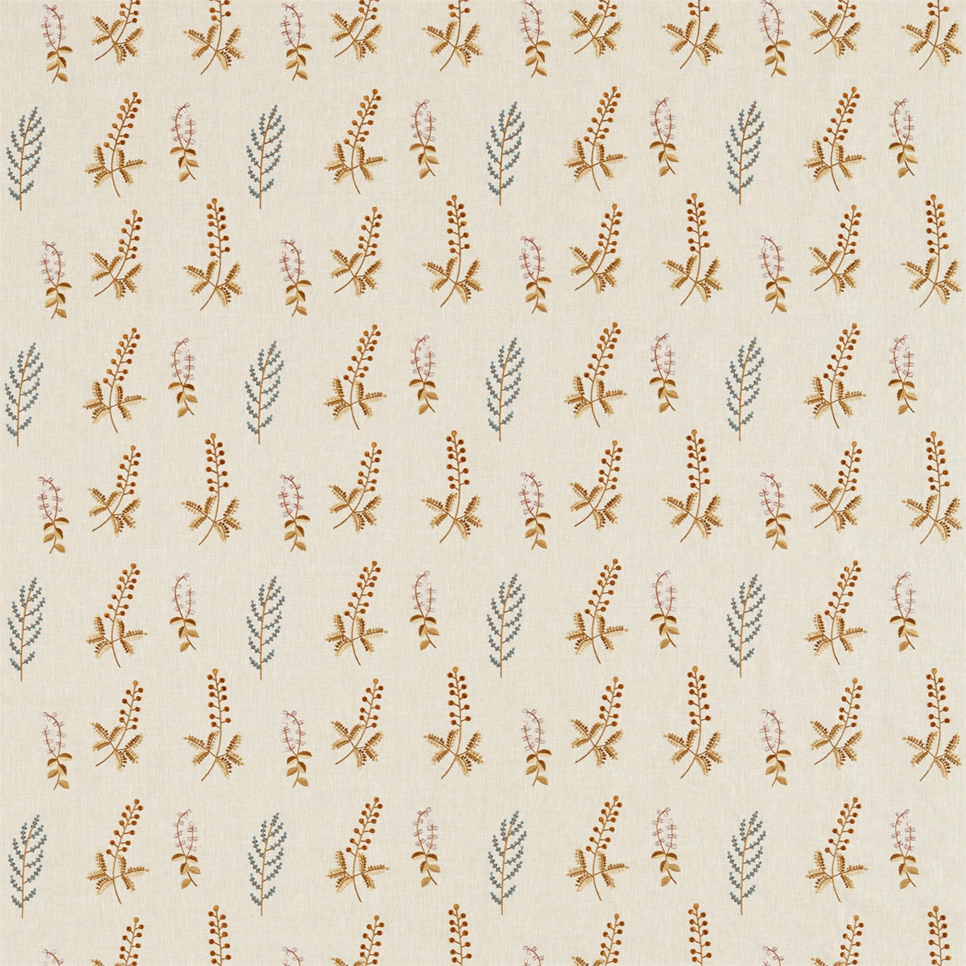 Bilberry Denim/Barley Fabric offers a charming countryside feel with its soft neutral background and stylized bilberry sprigs embroidered in denim blue and warm barley tones. Ideal for curtains, cushions, or upholstery, this fabric lends interiors a warm and timeless look.