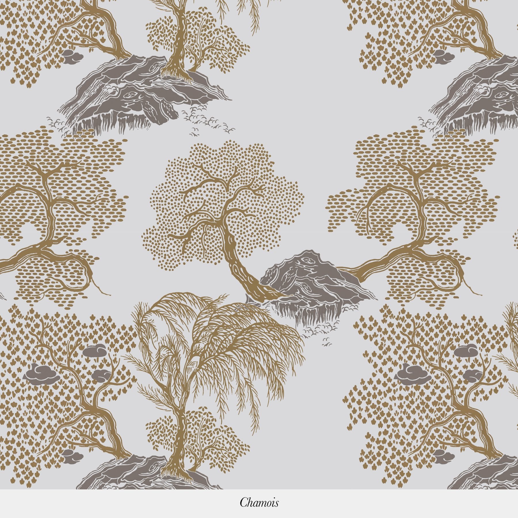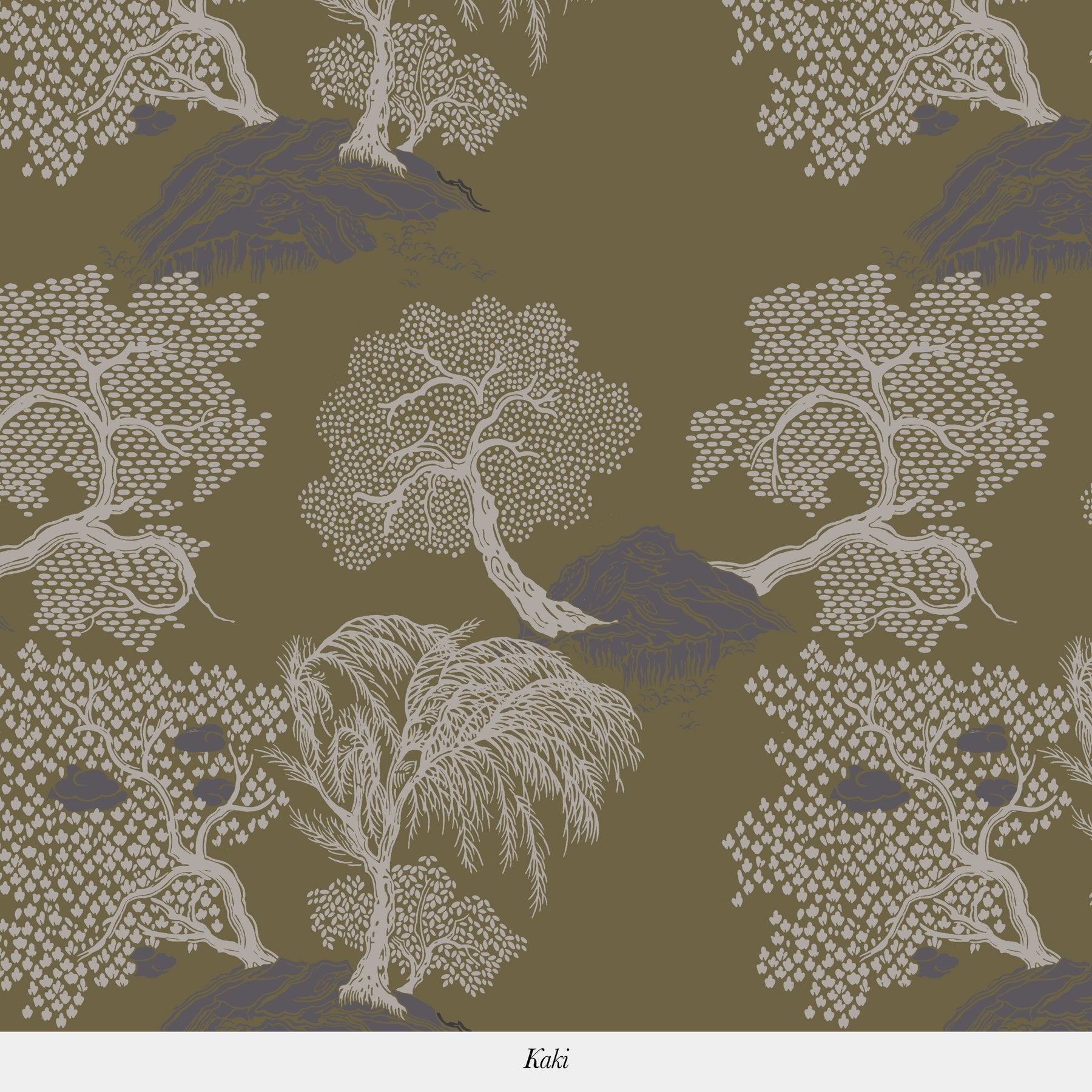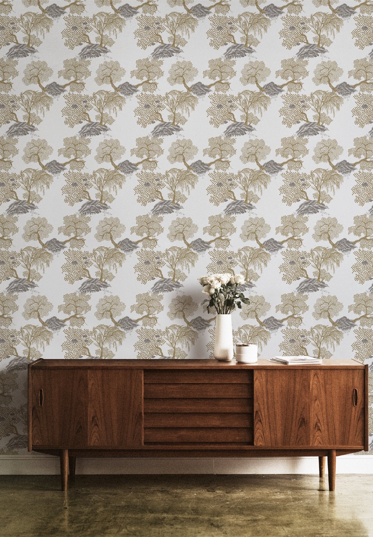 Introducing "Bonsai Garden" by Studio 198, a captivating wallpaper that brings the beauty and serenity of a Japanese-inspired bonsai tree garden into your home. This exquisite design showcases a pattern of small bonsai trees, meticulously depicted with an emphasis on detail and elegance.