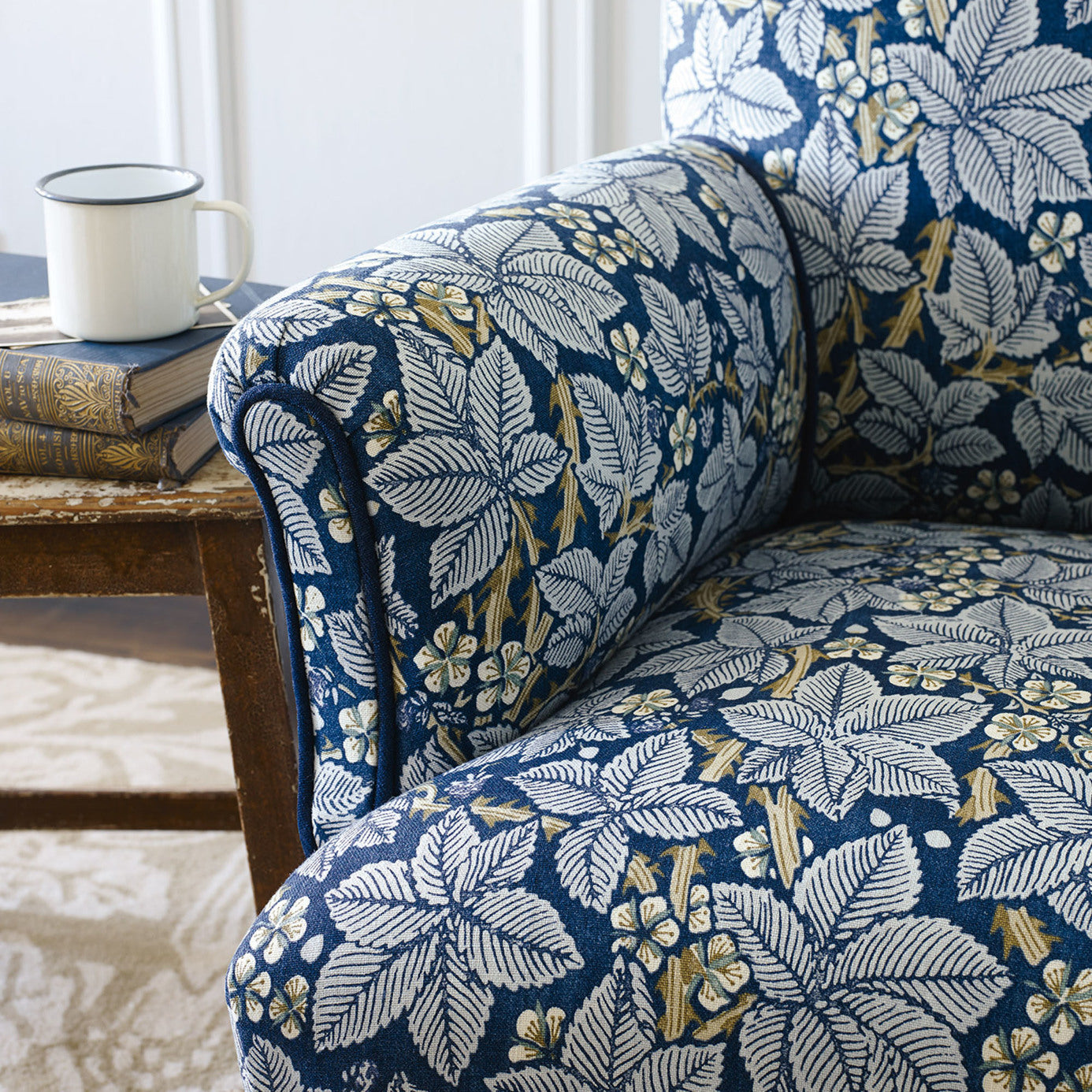 A stylised pattern of blackberry briars with berries and white flowers cover this upholstery fabric, designed in 1879 by Kate Faulkner - a talented sister of one of the partners of Morris & Co. Available as both a fabric and wide width wallpaper, this fabric design is produced in dramatic colourways.