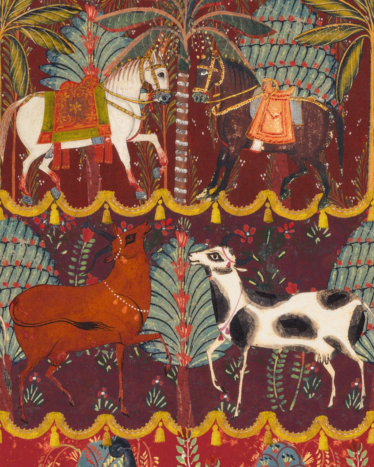Embrace the CARNAVAL spirit with horses, cattle and elephants adorned with decorative garlands and embroidered tapestries. Lose yourself amongst exotic foliage and vivid florals while the sound of music fills the air, which even the animals are dancing to. The vibrant colour combinations across the print bring it to life, bordered by tasselled, golden garlands which allow the eye and mind to transition between the settings, imagining the different scents which encapsulate you as you wander through the magical gardens in each scene.