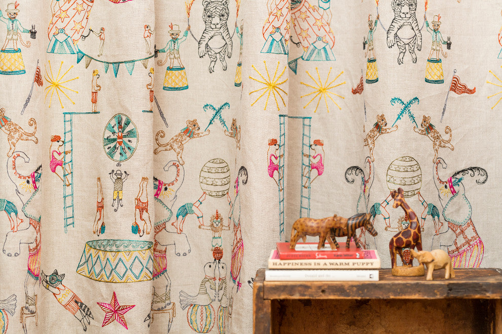 Circus Toile by Pollack is an embroidered fabric that brings a whimsical charm to curtains and light upholstery. With its intricate embroidery and playful design, Circus Toile adds a touch of artistic flair to your interior. Crafted with attention to detail, this fabric is perfect for adding a decorative element to your window treatments or accent pieces.