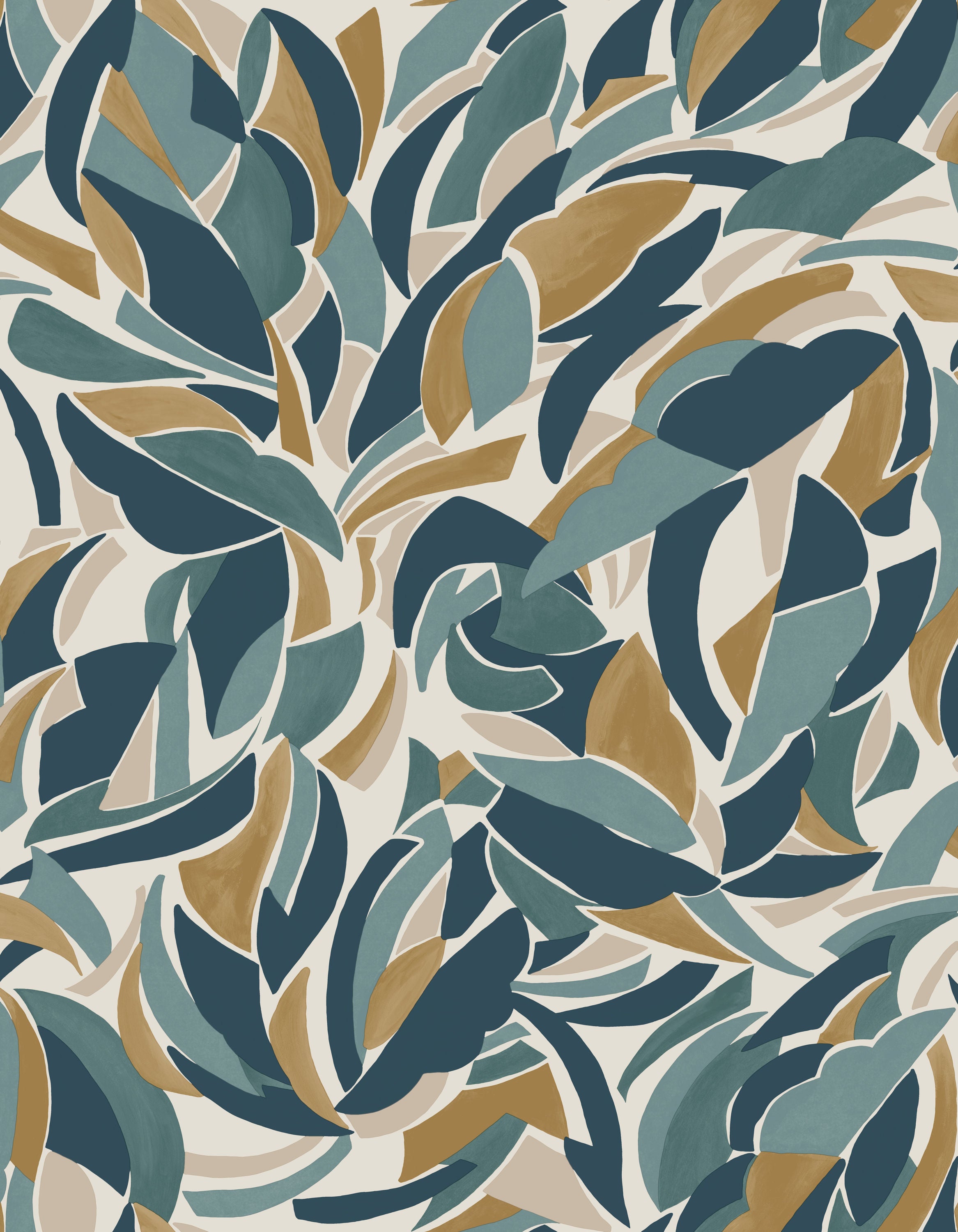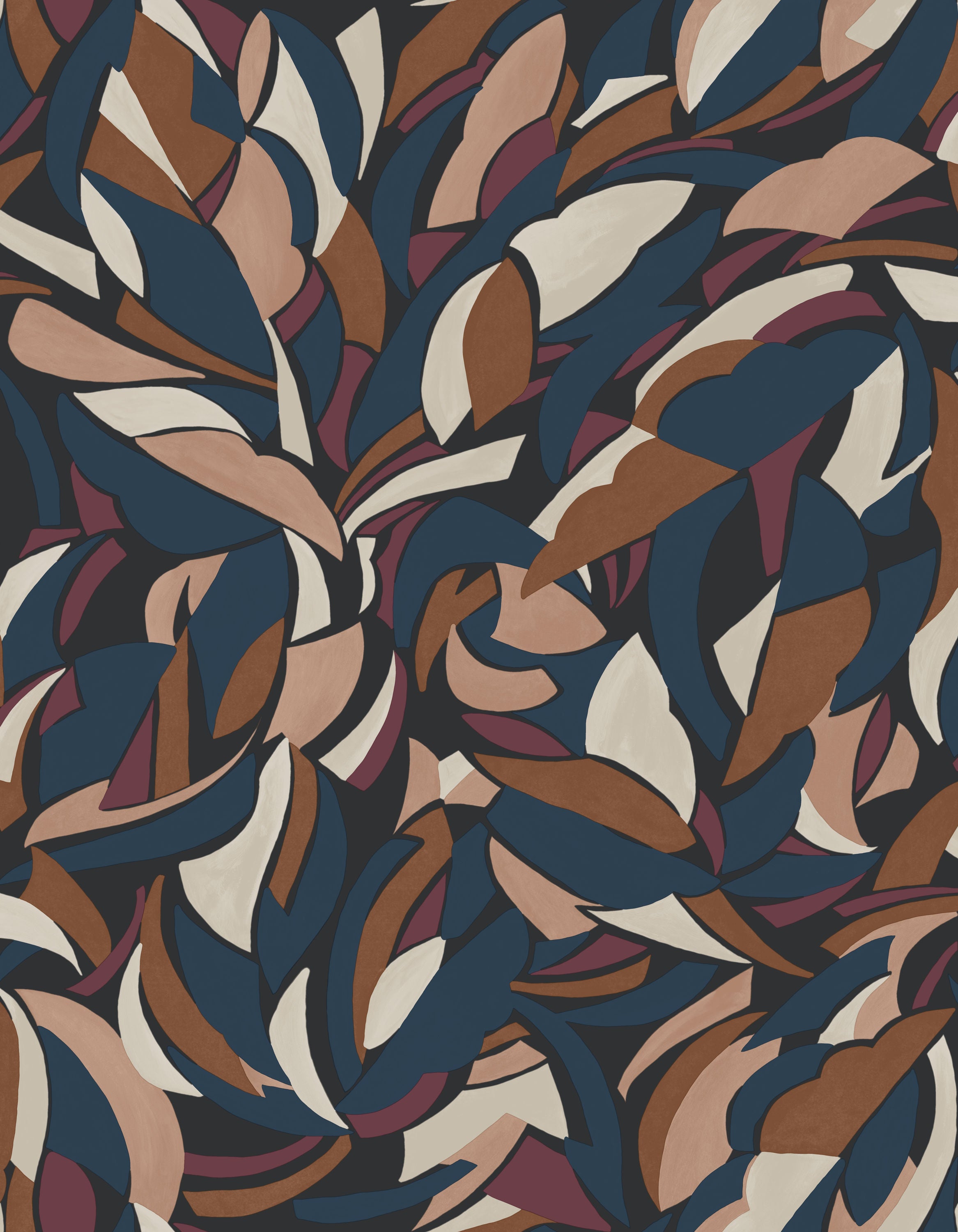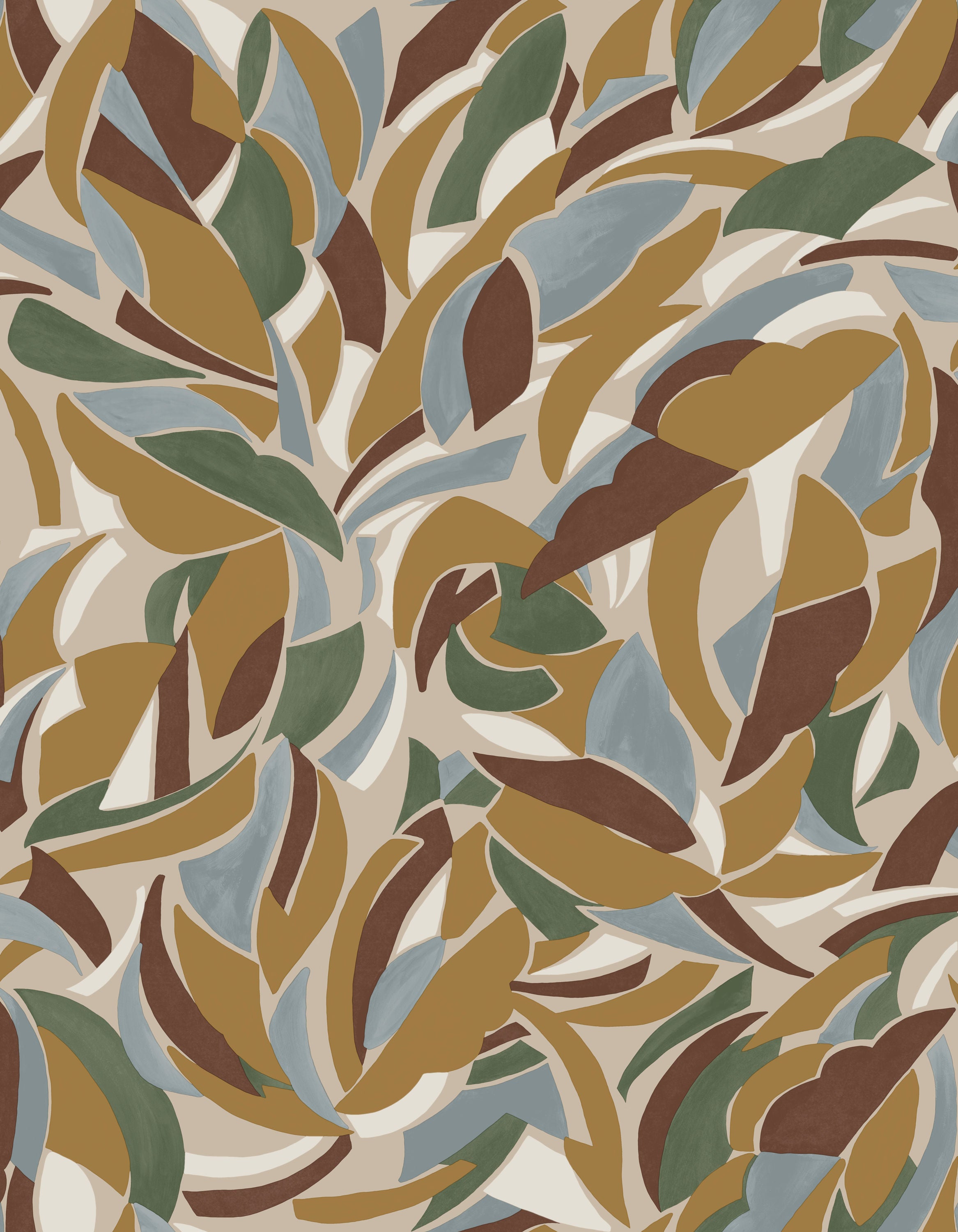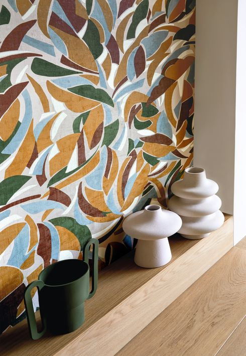 The designs recalls a work of art composed of multiple collages. The planes of colours seem to be randomly placed, adding an impetuous character to the composition. They retain a hand drawn quality and the brushstrokes on the canvas. Produced using rotogravure on two irregular grains, the printing technique gives the design and the blend of colours their finesse.
