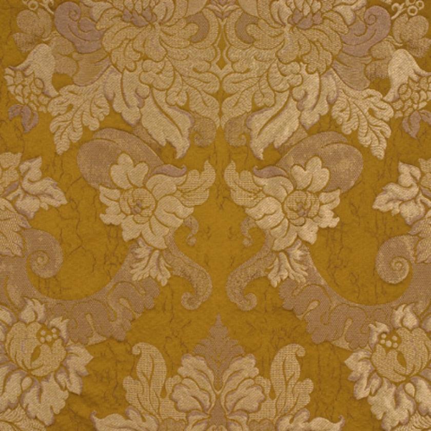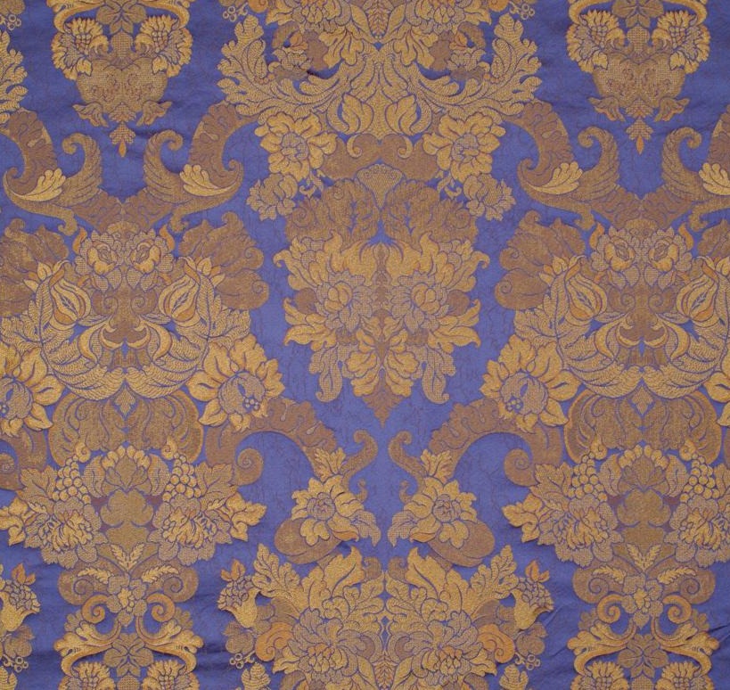 Cuoridoro was the name given to producers of embossed leather in Venice. Since ancient times, the Venetians have practiced the art of gilding the leather and hide used to clad the walls of rooms, seats, books and other surfaces. This rich lampas takes a fresh look at the motif of a rare example of this refined art kept in a room of the Renaissance Palazzo Vendramin Calergi. An exaltation of flowers, leaves and fruit proceed vertically, joined together by elegant rocaille volutes drawn by acanthus leaves. The weave, of high technical quality, is further enhanced by the choice of fibres, giving light to the pattern and helping simulate the grain of the leather on the satin ground by means of deliberate floats of the weft.