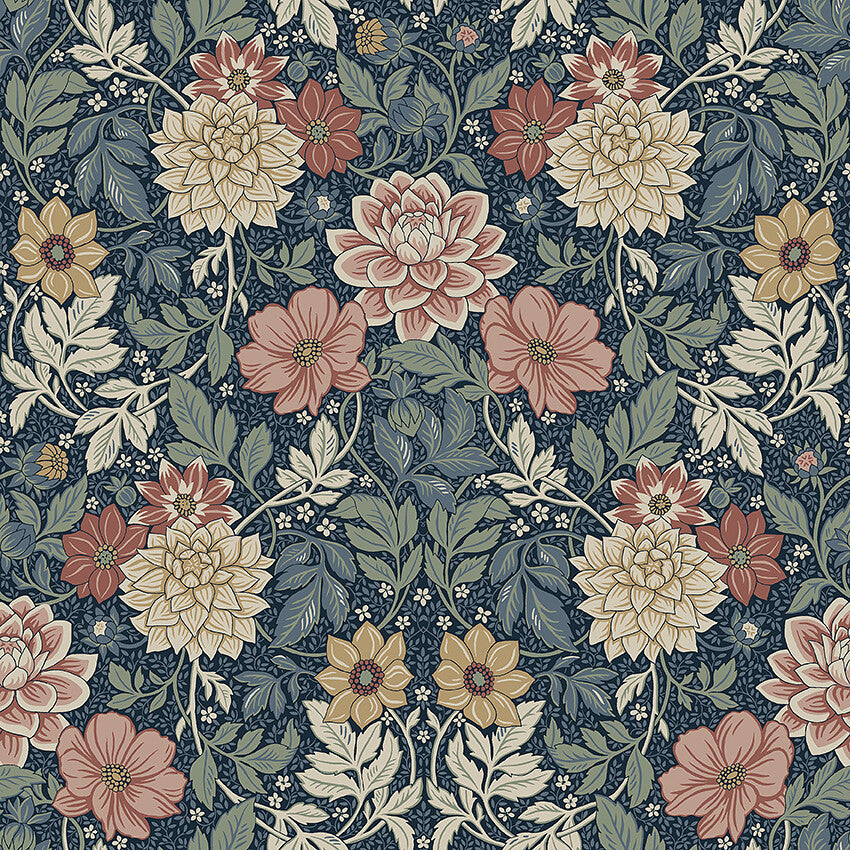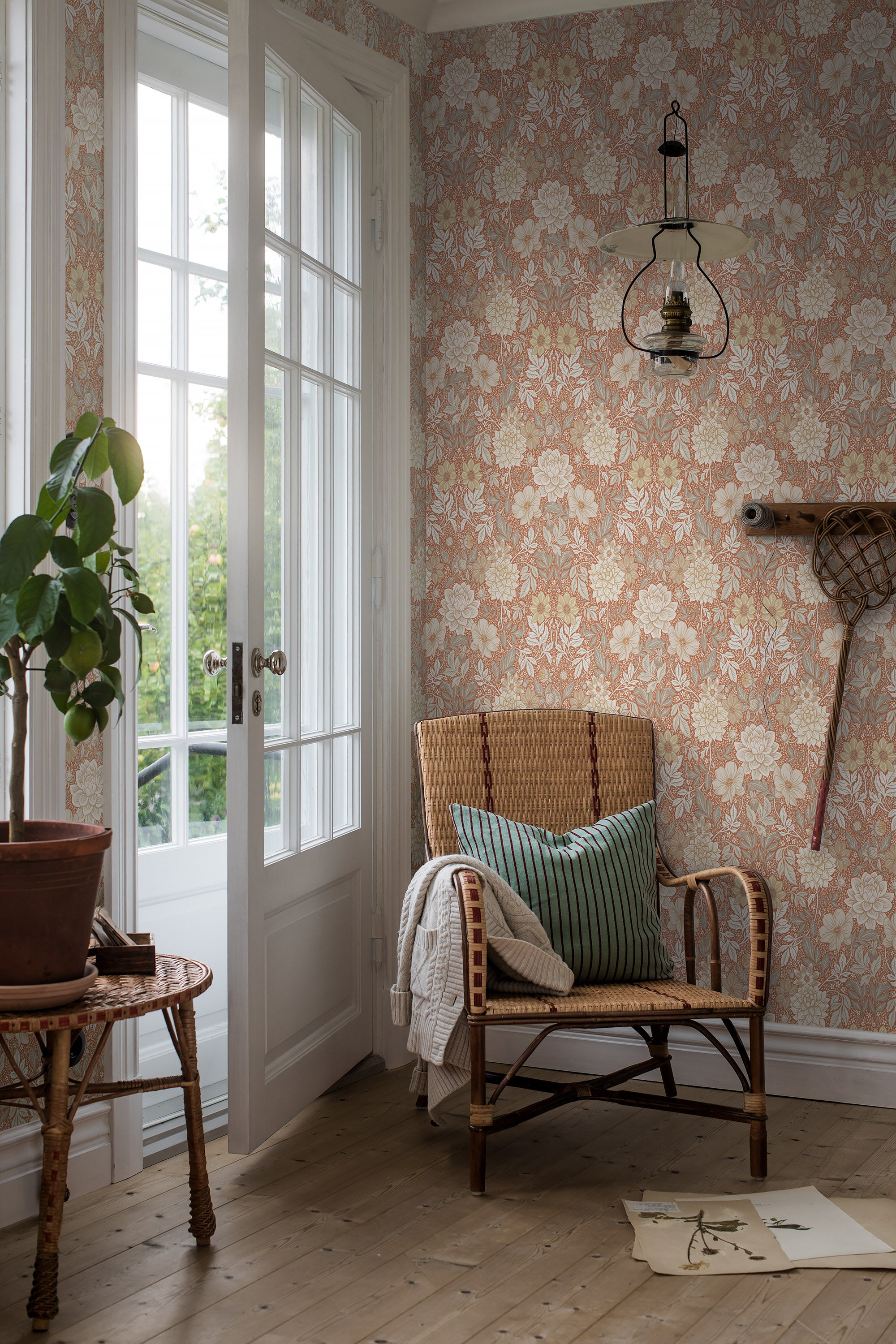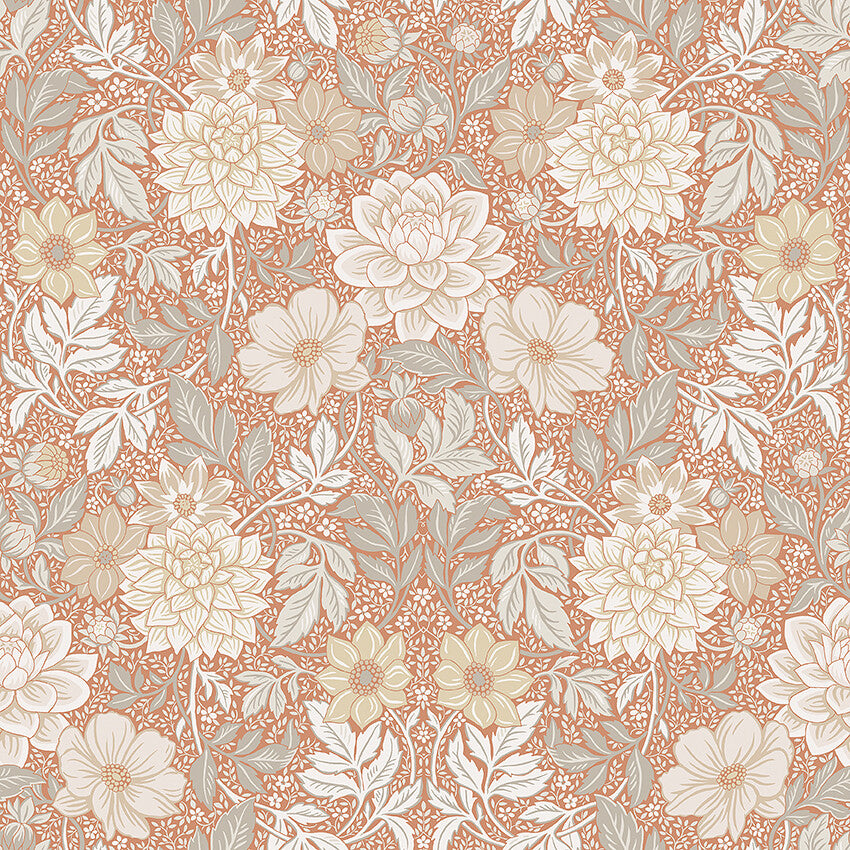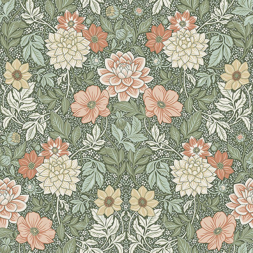 Coloured in a palette of rich and vibrant tones, our Dahlia Garden wallpaper mingles shades of green with rusty reds and yellows to develop a vintage aesthetic that’s filled with rustic appeal. Capturing the beauty of late summer days, its verdant flowers and detailed foliage create a soothing and harmonious sanctuary in your home. Hang it in your living room, kitchen, or dining area for effortless elegance.