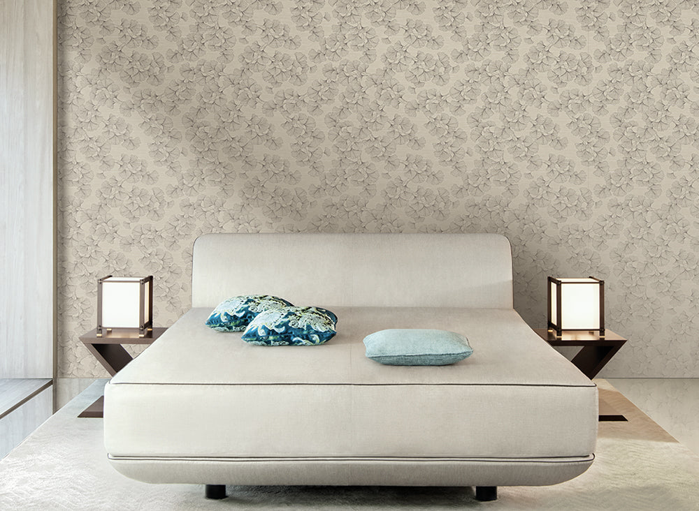 Macro-scaled ginkgo leaves characterize this wallcovering, named after the millenary city of Dali in China. The leaves look like they were drawn with subtle lines on the three-dimensional background, marked by a shantung silk effect with its typical knots and irregularities. The timeless beauty of ginkgo trees - symbols of endurance and regeneration - recalls the Armani values and the taste for Oriental influences.