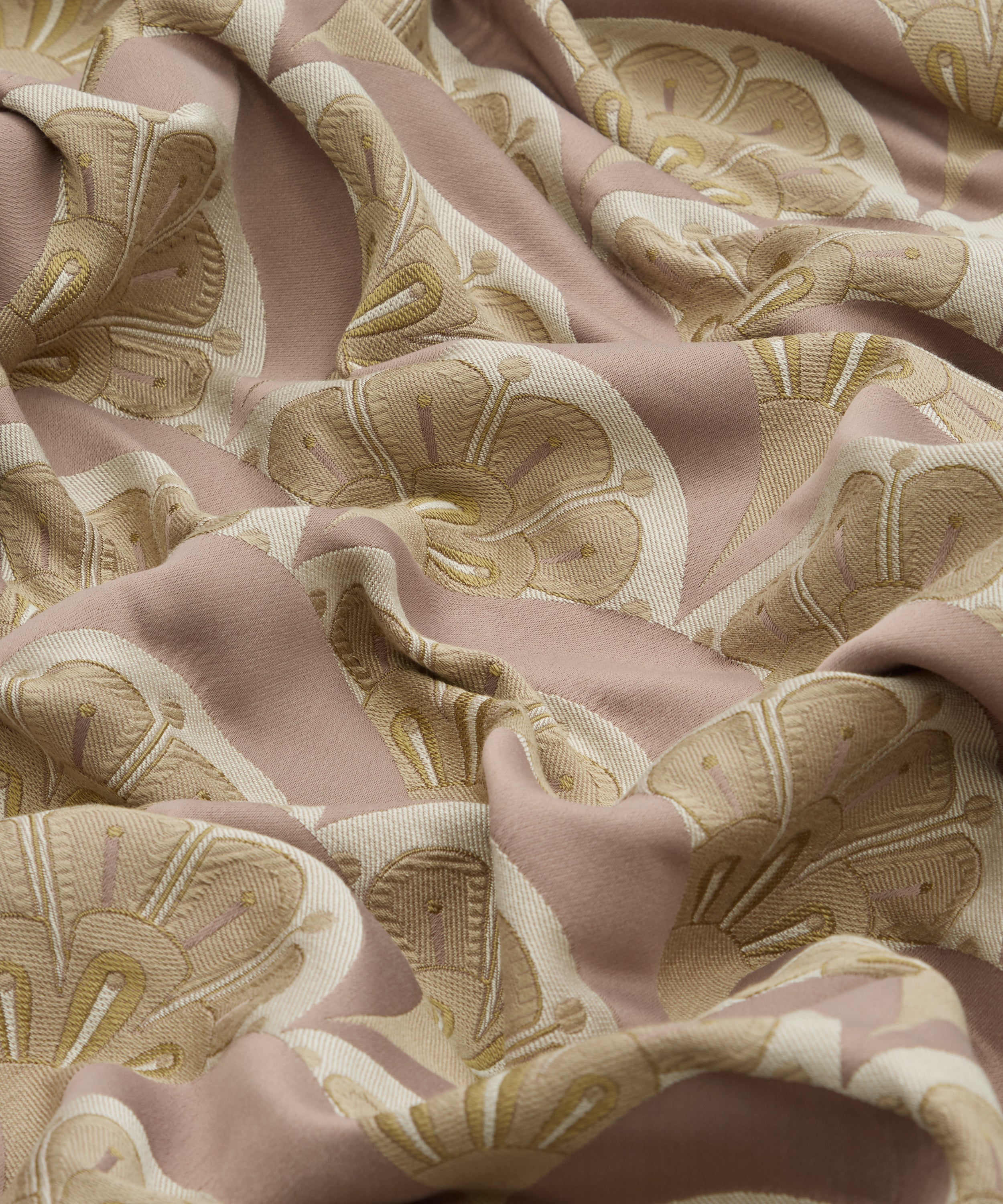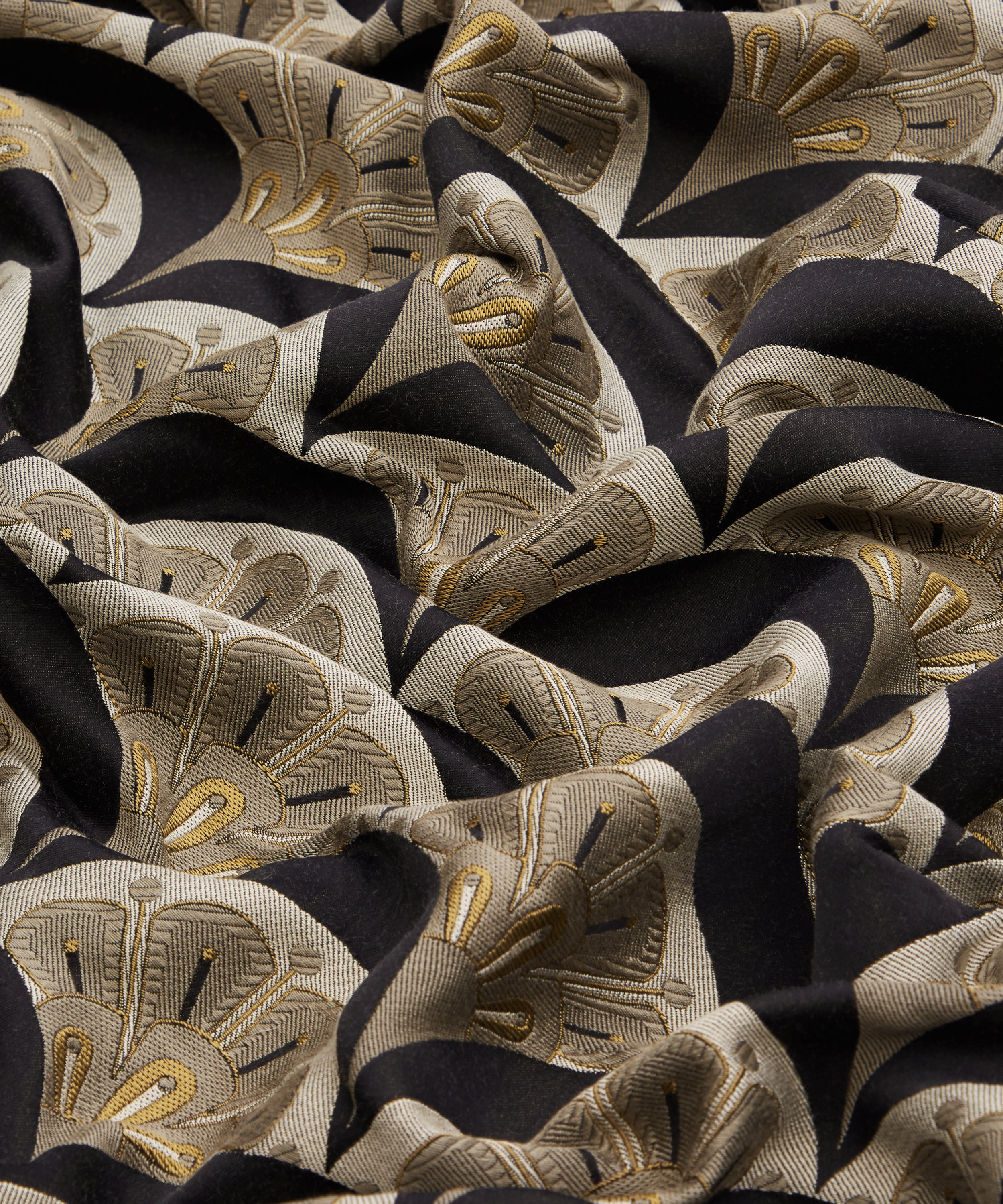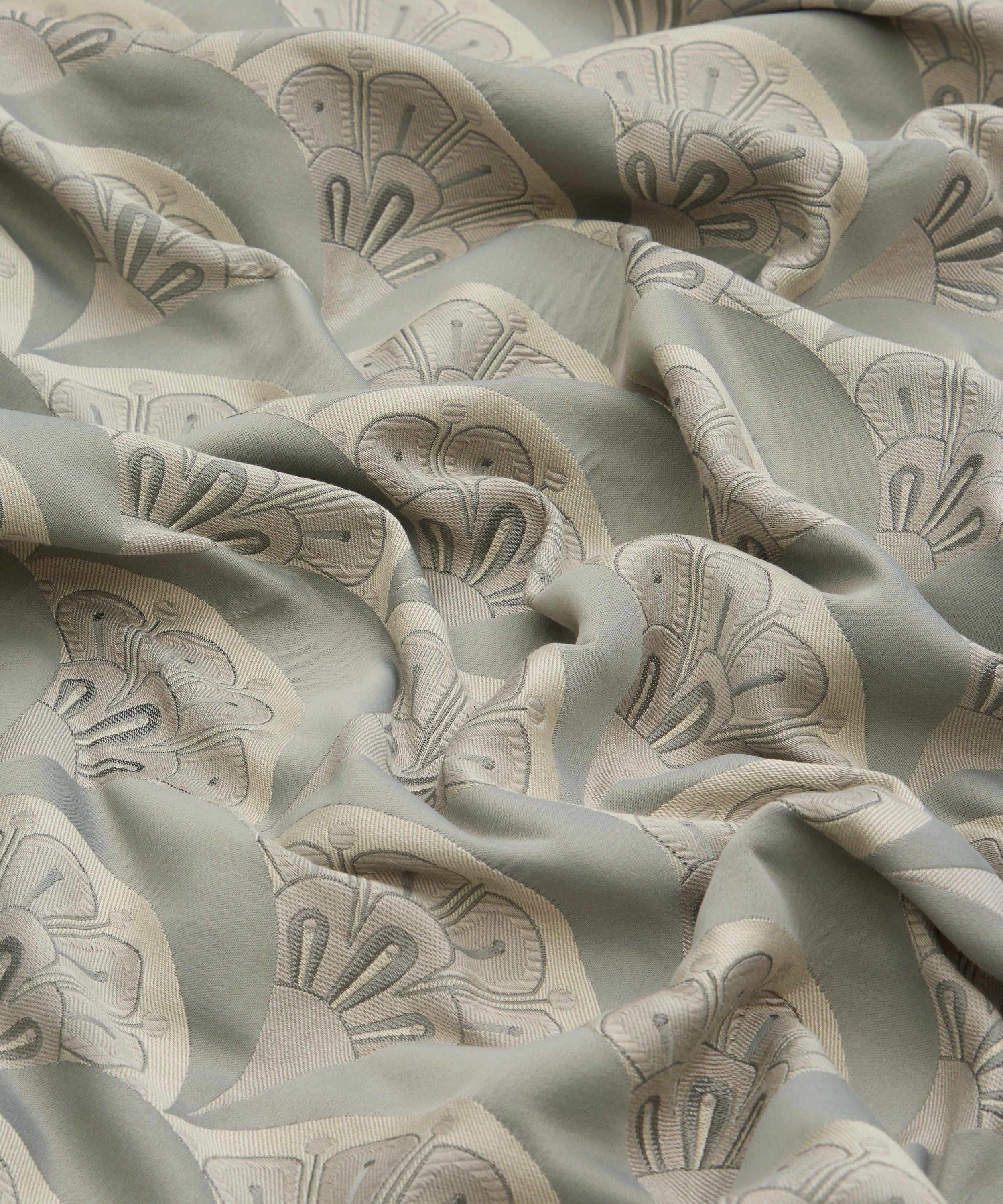 Deco Scallop is inspired by Liberty’s archive catalogues of the late 1890s to 1910s, when beautiful Japanese Art Deco fans and wallpapers were imported alongside fabrics, jewellery, porcelain, screens, and rugs. The motif was developed by the Liberty design studio as a simple contemporary woven jacquard design – a modern take on the Liberty peacock feather and Art Deco fan.