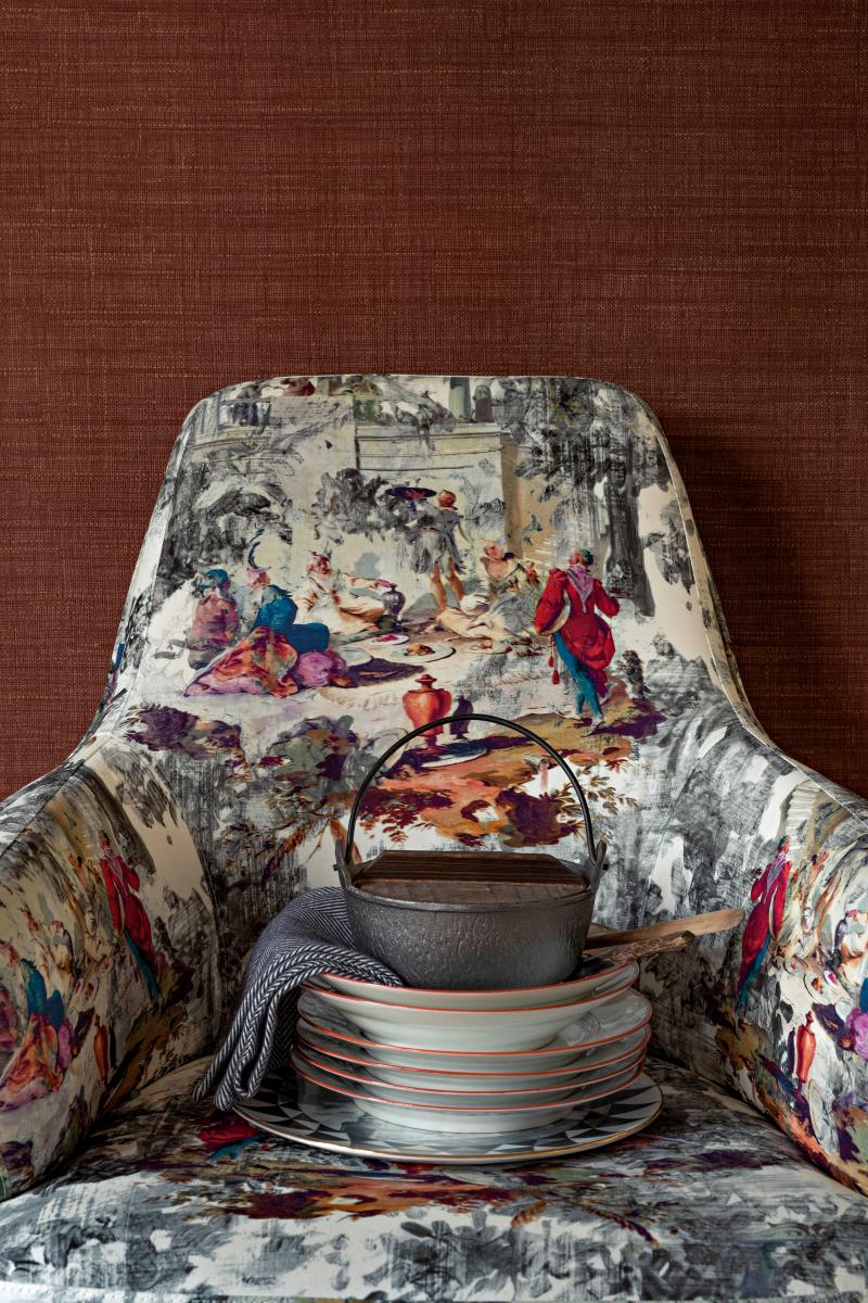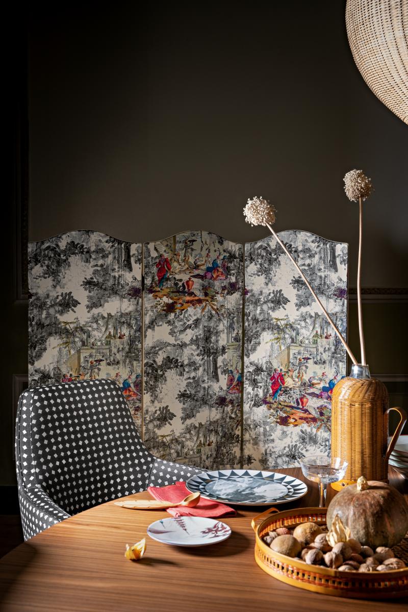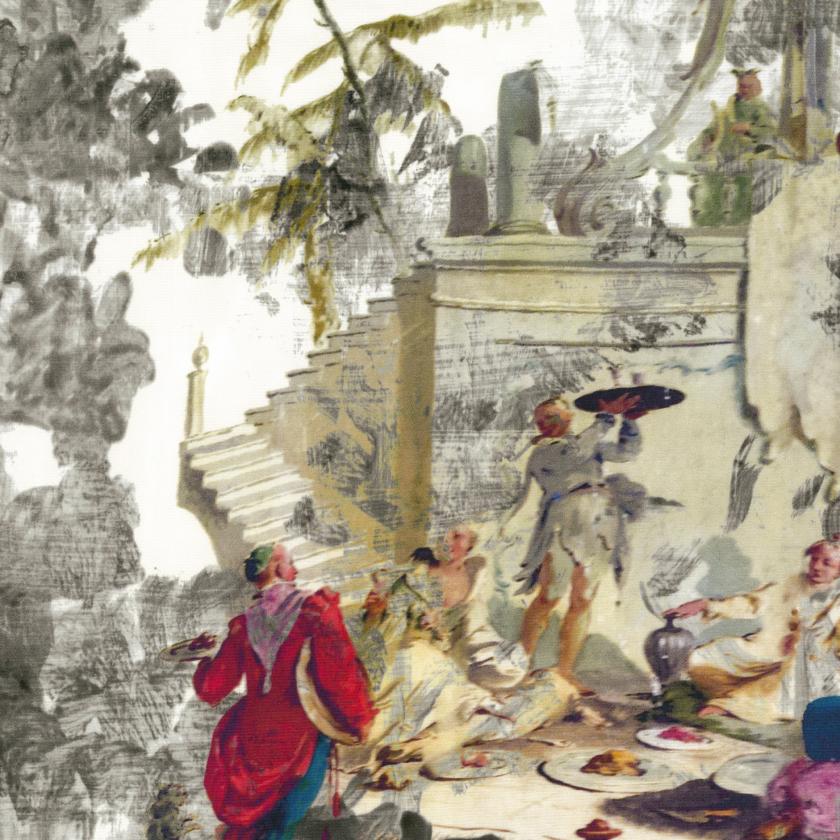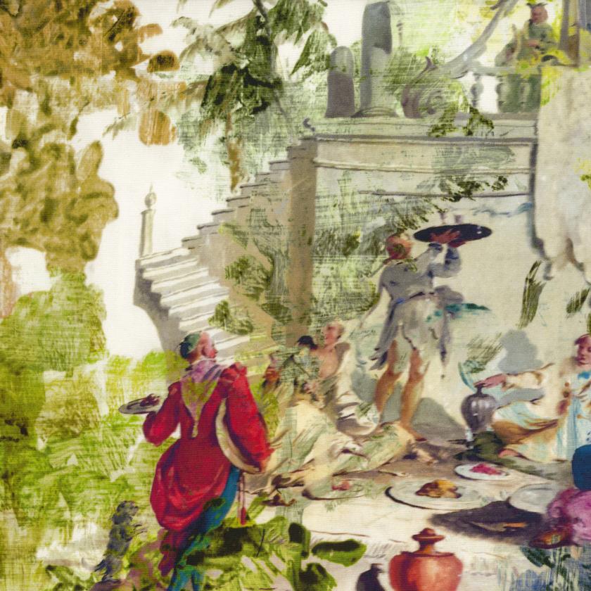A rethink on toile de Jouy, Déjeuner sur l’herbe is populated with elegant figures in eighteenth-century clothes, while the Neoclassical belvederes and glade are animated by voices and other sounds in an idyllic and carefree picture. A pure cotton print, suitable for upholstery.