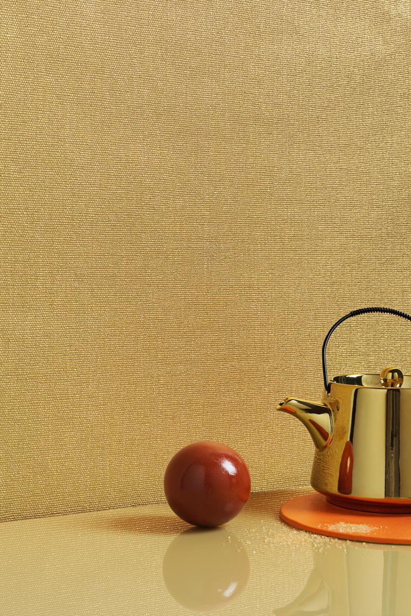 The preciousness of gold for a glamorous touch. A vinyl on embossed nonwoven fabric with the appearance of a fabric with a very fine weave that recalls a chiselled artefact. The encounter between textile art and the art of goldsmithing in a covering that is intentionally ostentatious, but decidedly sophisticated.