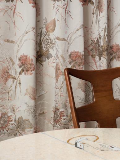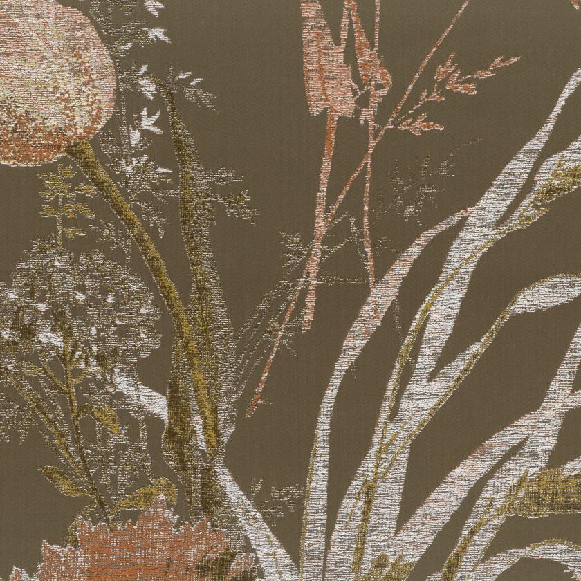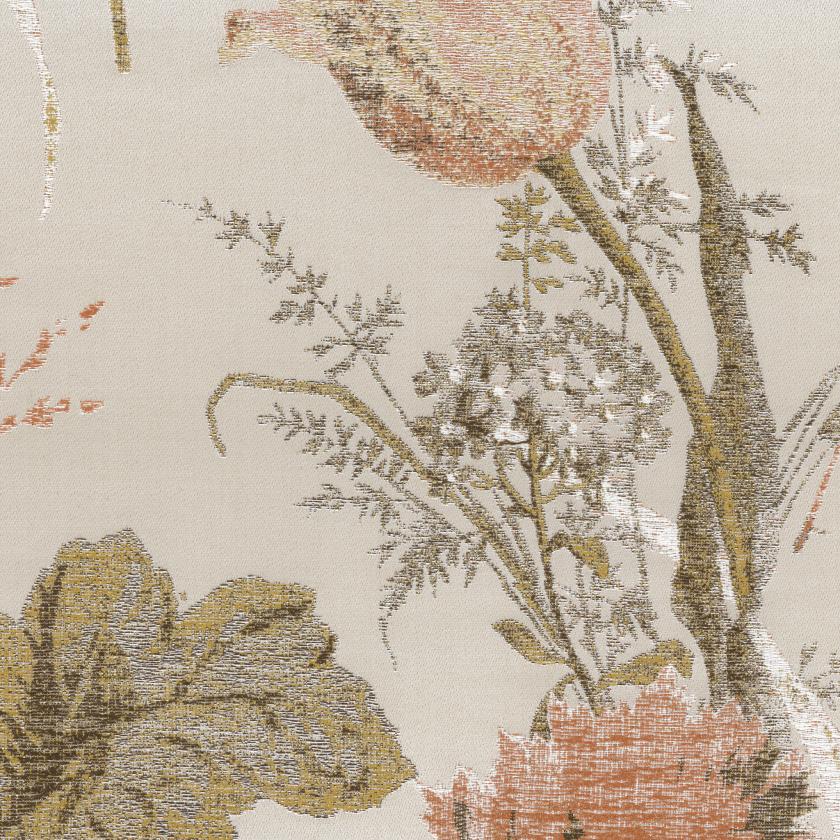 Lampas on a silk satin ground. It is an interpretation of delicate floral prints on gauze, an original document from the 19th century, recently acquired. This precious lampas features very naturalistic flowers of large proportions which, in the virtuosistic technical interpretation, have been desaturated in colour to let the weaves speak, without giving up the three-dimensionality. Available in 2 variants with the same weft colours on an ivory ground and a dark khaki ground, Emily is suitable for decoration.