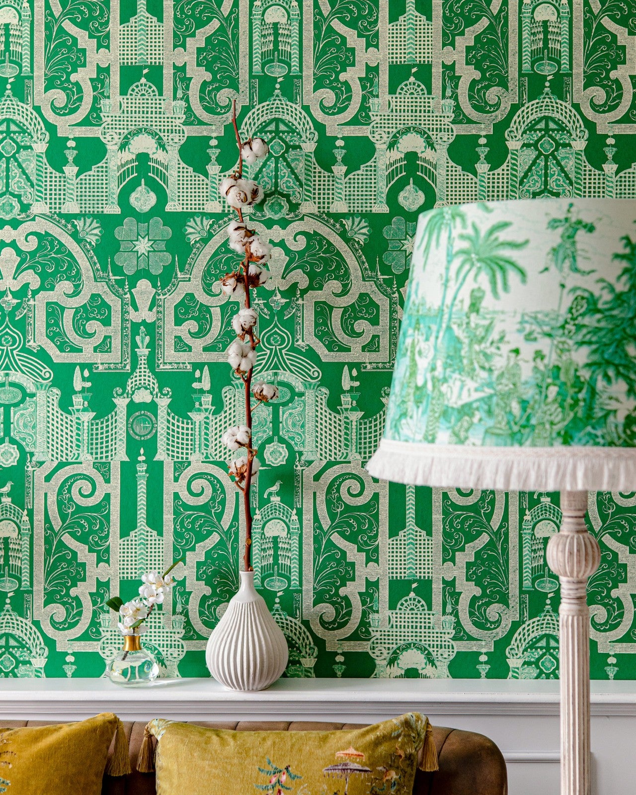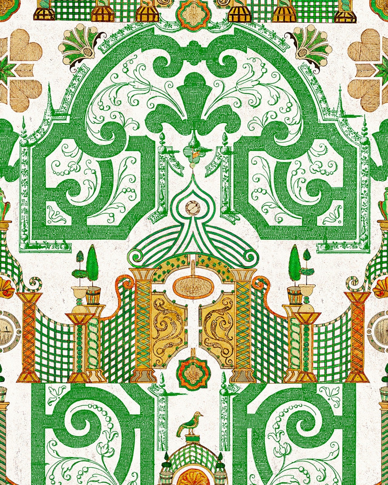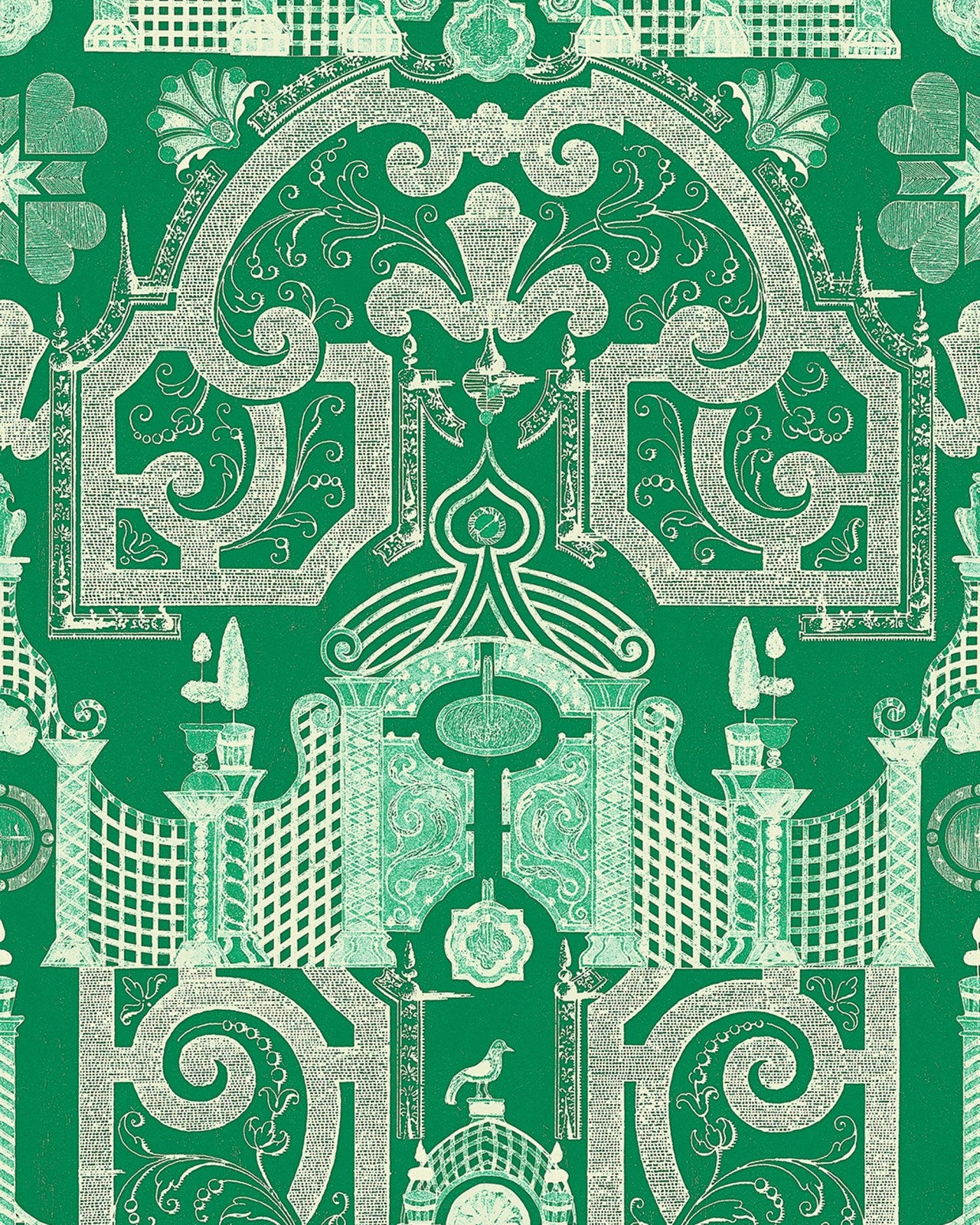 Displaying a captivating, detailed pattern of an old Chinese maze garden, the EMPEROR’S LABYRINTH is a marvellous work of art and a riveting background setting. Inspired by an old drawing created to celebrate the eighteenth century Imperial gardens, this design praises the uniqueness and perfection of shrubberies and bushes grown on royal grounds. Symbolising wealth and growth, the deep green shaded layout brings harmony and outdoor soothing vibes to your indoor spaces. Available in a deep greenlake monochromatic and bright orange with green colour scheme.