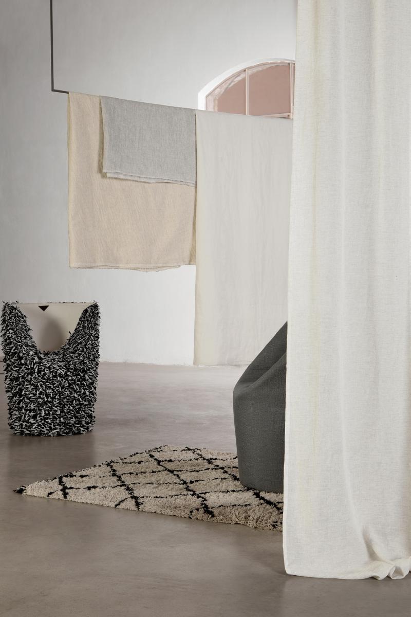 A simple and lightweight wool and linen blend cloth, highly sophisticated. The name is intended to indicate the distinctive and understated nature of the sheer (in double width and yarn dyed) whose pattern comes from a simple right-angled relationship between warp and weft.