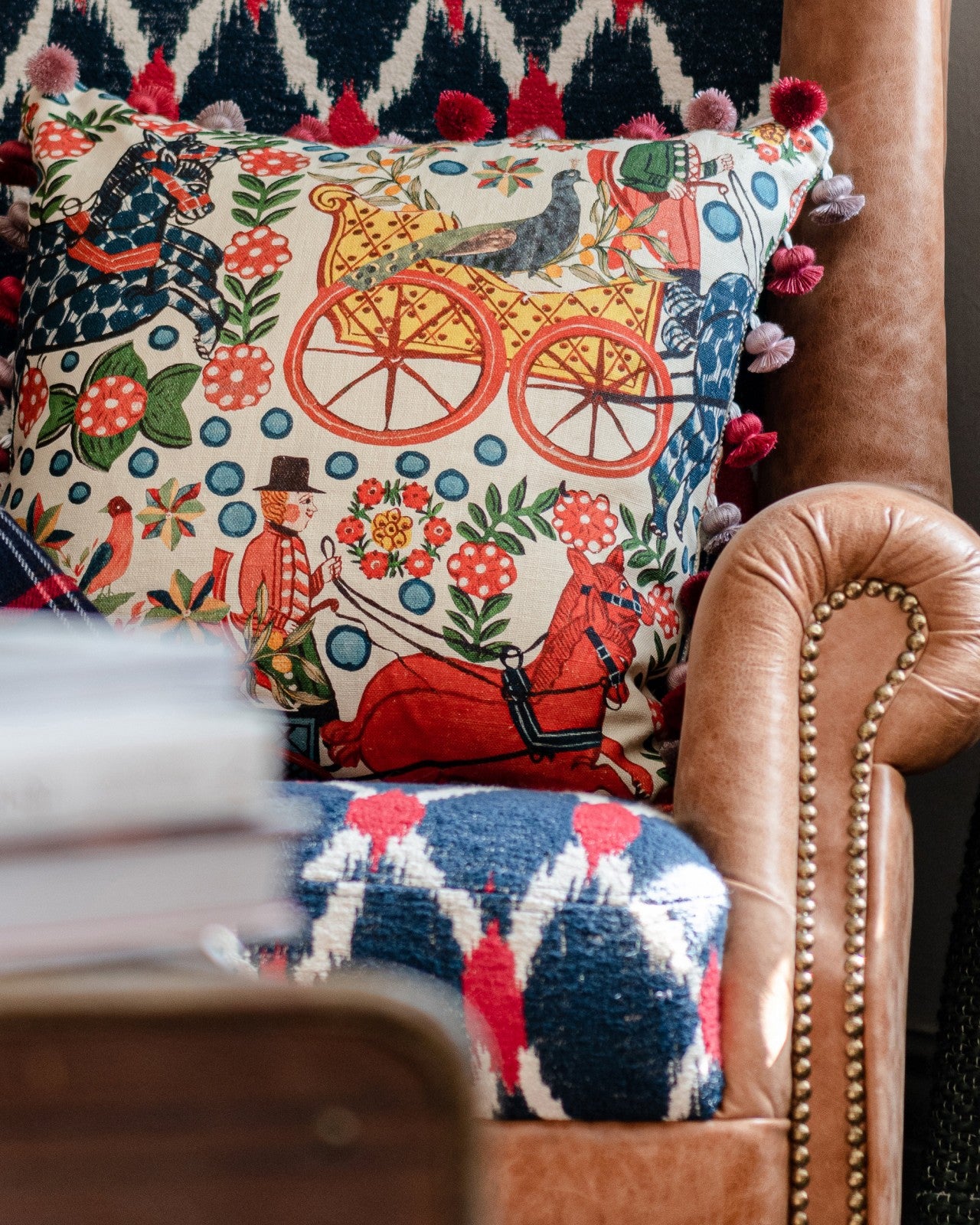 Be transported directly the wondrous Carnival of Basel with FASNACHT, an explosion of pattern that embodies the spirit of Switzerland’s favourite festival. A parade of colourful carriages, top hatted coachmen and high stepping horses trot across this joyful fabric, all intertwined with folkloric flowers and handsome peacocks.