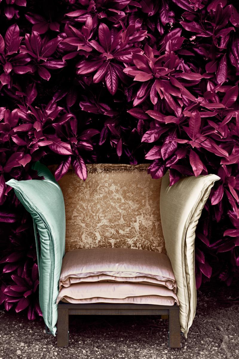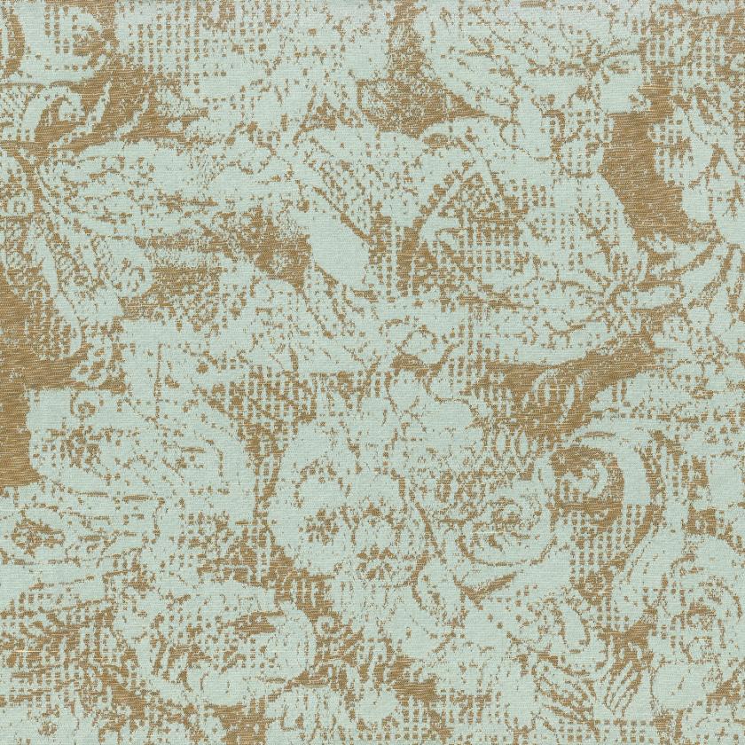 The pattern of a fragment of fabric, taken from a collection of historical plates, was completely reprocessed, broken up and put together again. The result is a pattern similar to filigree where the shine of the silk interacts with a mix of lurex textures. Suitable for light use.