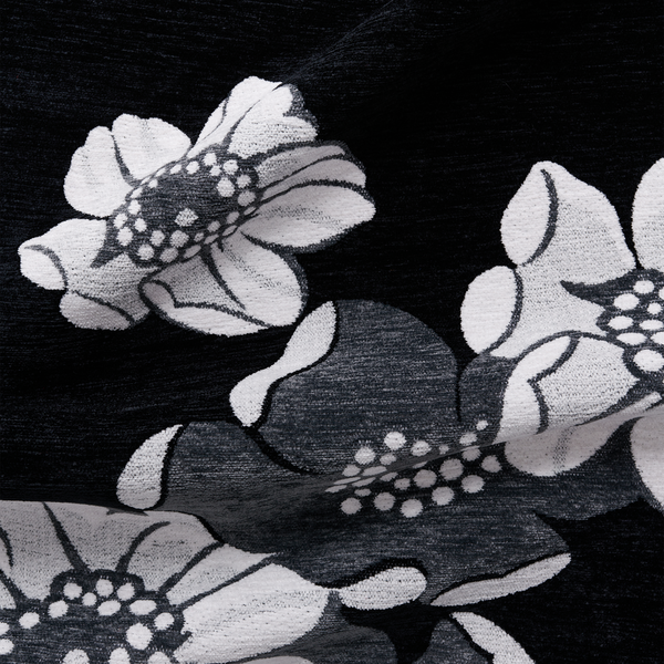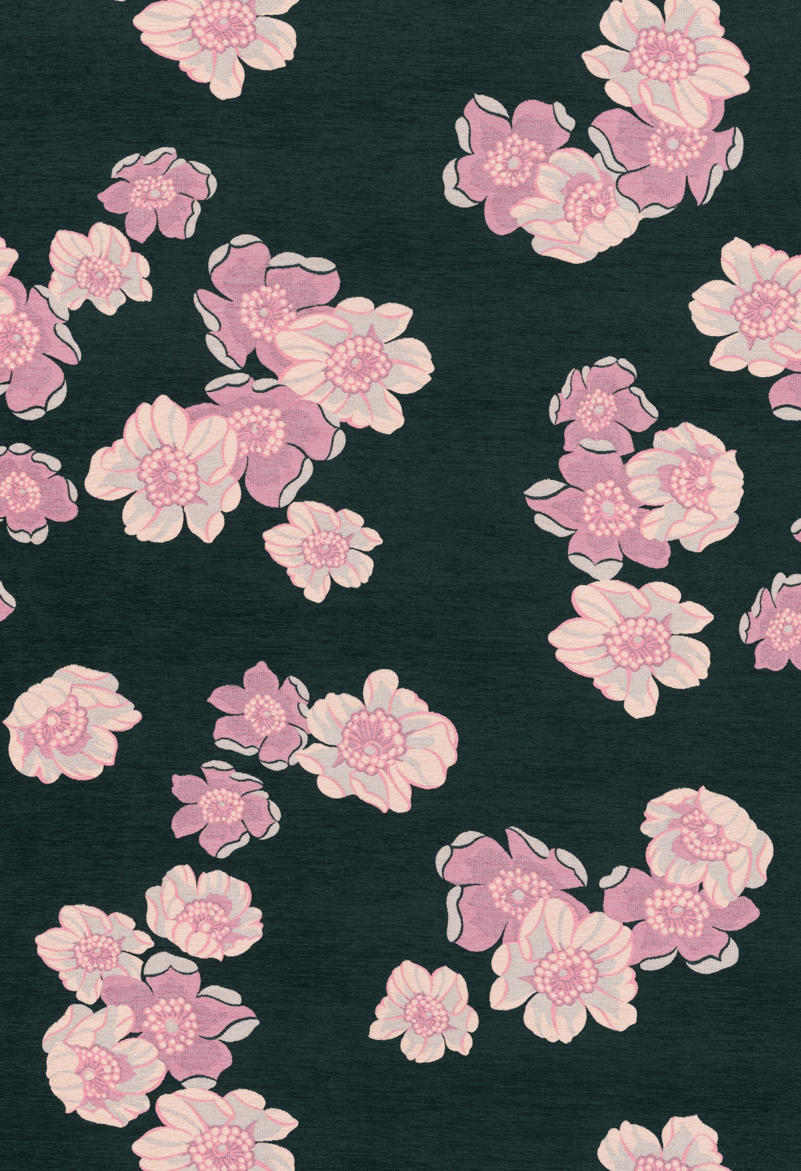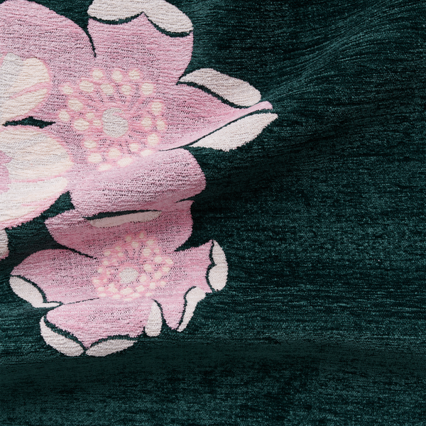 Explicit and implicit, an epic floral pattern sparingly placed on a heavy chenille. Fiorella is highly evolved and weighty from its triple layers and yet light in spirit. Its graphic flower framed by expanses of blank space is reminiscent of a Robert Mapplethorpe still life. Colours reflect its positive sensibility, pink forest, pale blue, mandarin, sand beach and graphite.