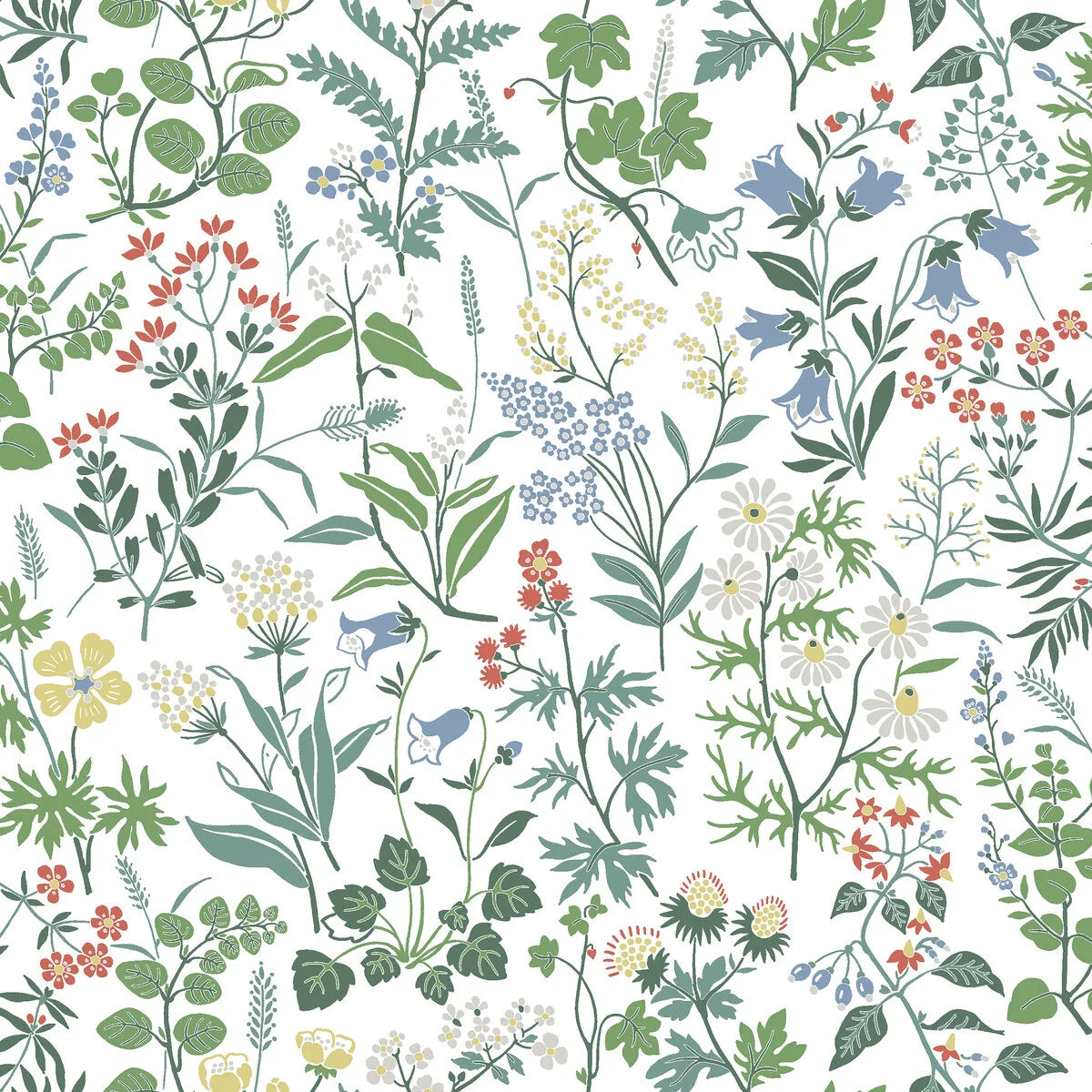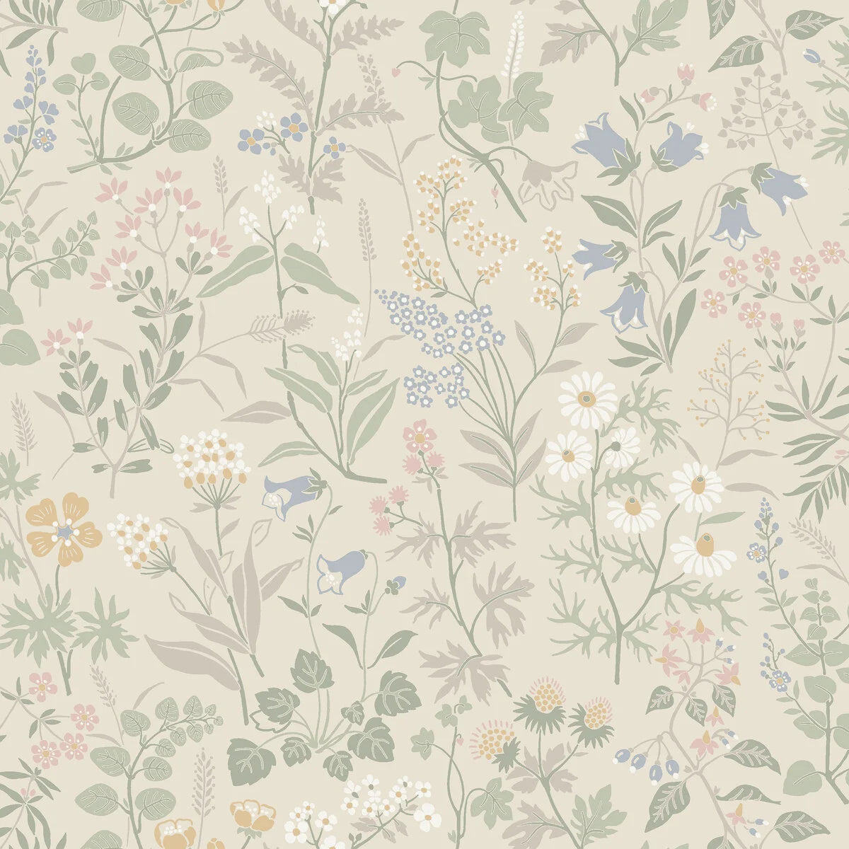 Coloured in a pretty pastel palette of green, pink, yellow, white and blue, our Flora wallpaper celebrates the sublime sights and scents of a Swedish spring meadow. Simple, stylised flowers crawl across the walls in this dense floral pattern to create a calm backdrop in which to relax and entertain.