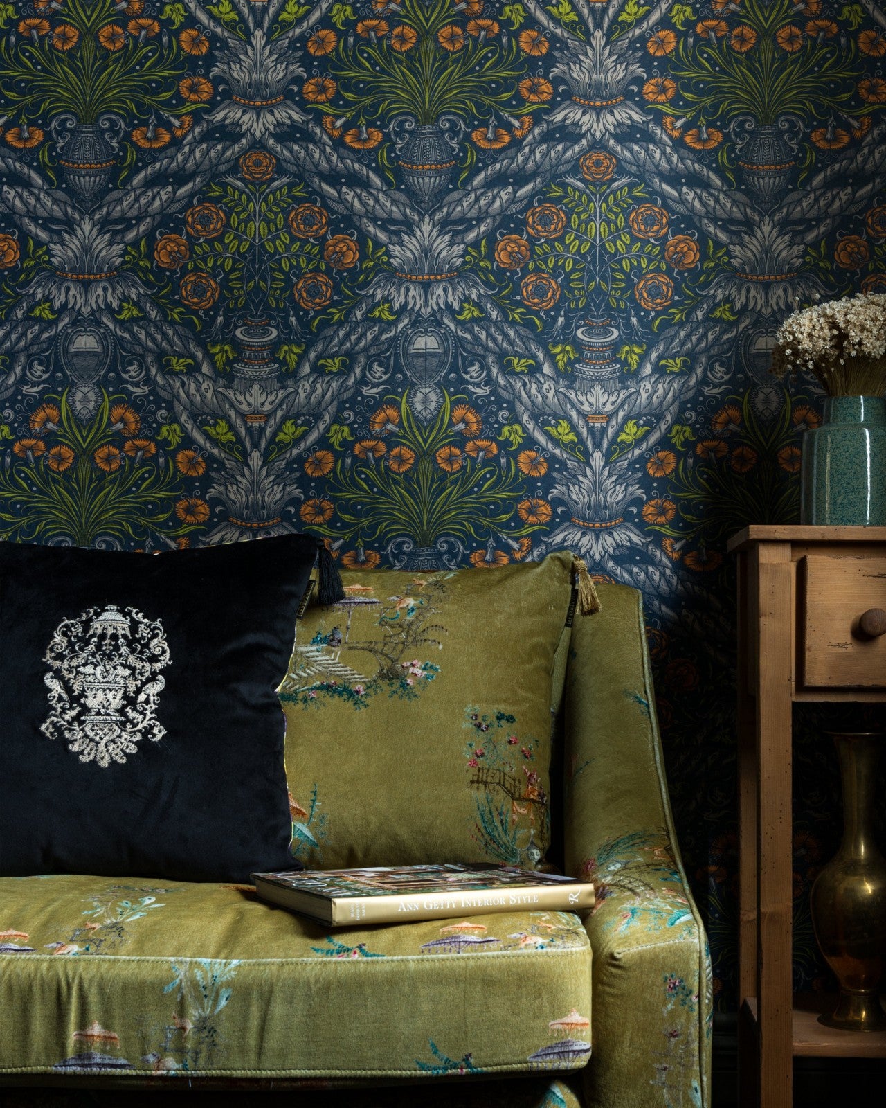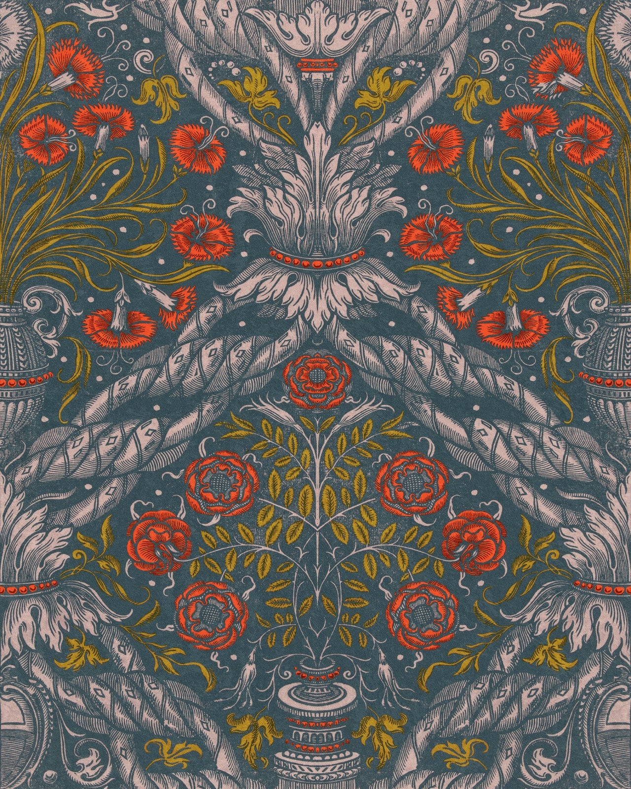 A decorative ornamental wallpaper made after an antique woodcut drawing showing beautiful roses and carnations combined with twisted link chains. A classic style design perfect for pairing with a statement style wallpaper design.