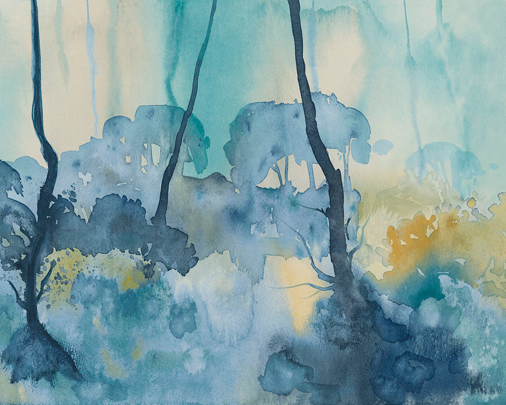 This design reflects intertwining silhouettes of slender forest tree trunks layered with abundant foliage. The contrasting shadows and light renders a multi-dimensional vista to the room so that you feel encapsulated by nature.