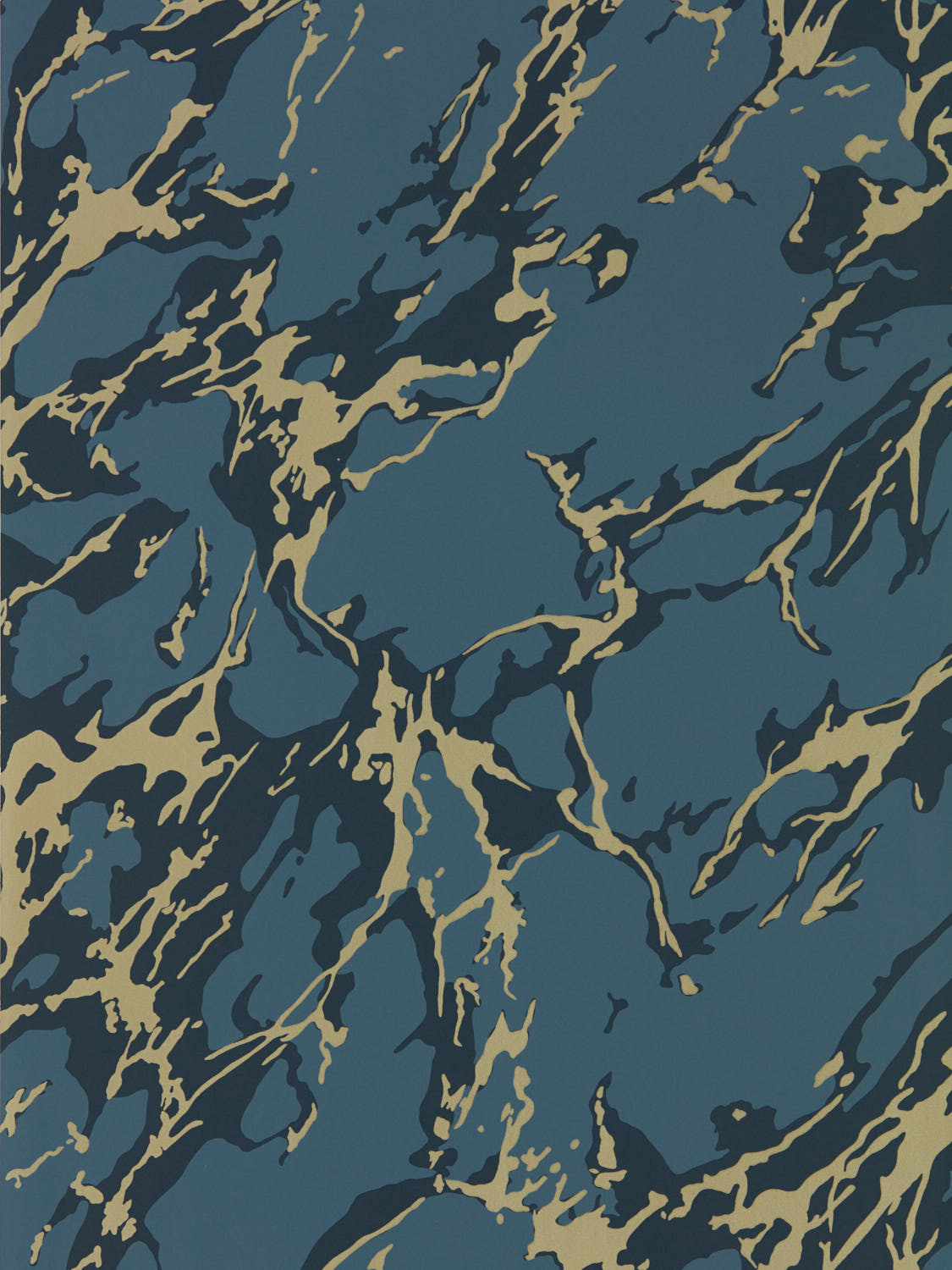 Evoking the colours of natural cut marble, this rotary printed wallpaper has a contemporary aesthetic and a lovely chalky ground. Originally produced by Zoffany as part of its Folio collection, the French marble that inspired this design is a symbol of elegance and refinement, gracing the entrance halls of country houses throughout Europe. The dramatic Reign Blue colourway has metallic gold markings, in contrast with the calming aesthetic of Perfect White.