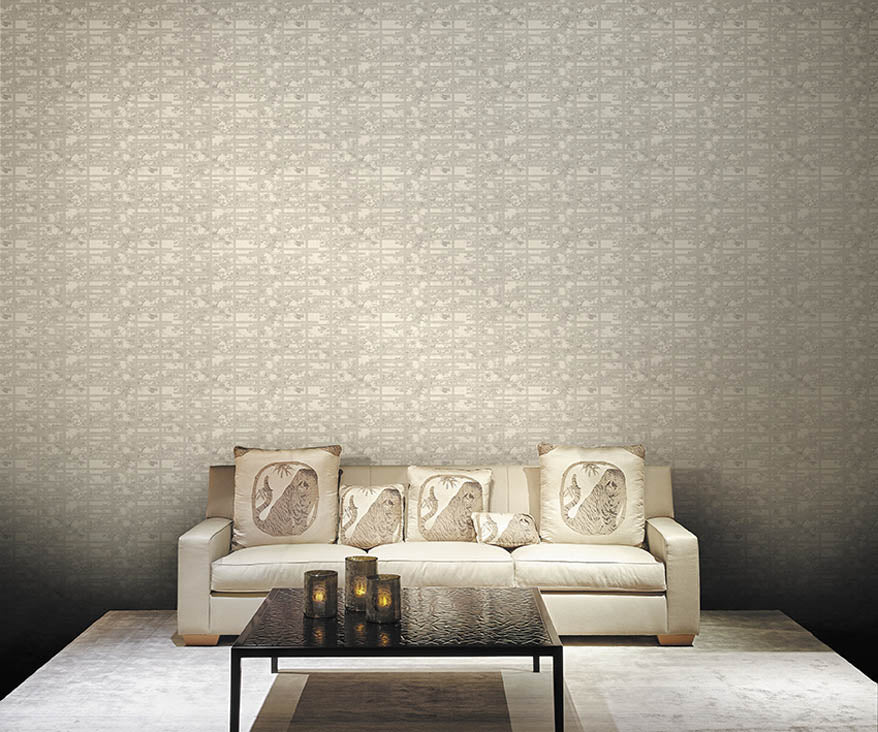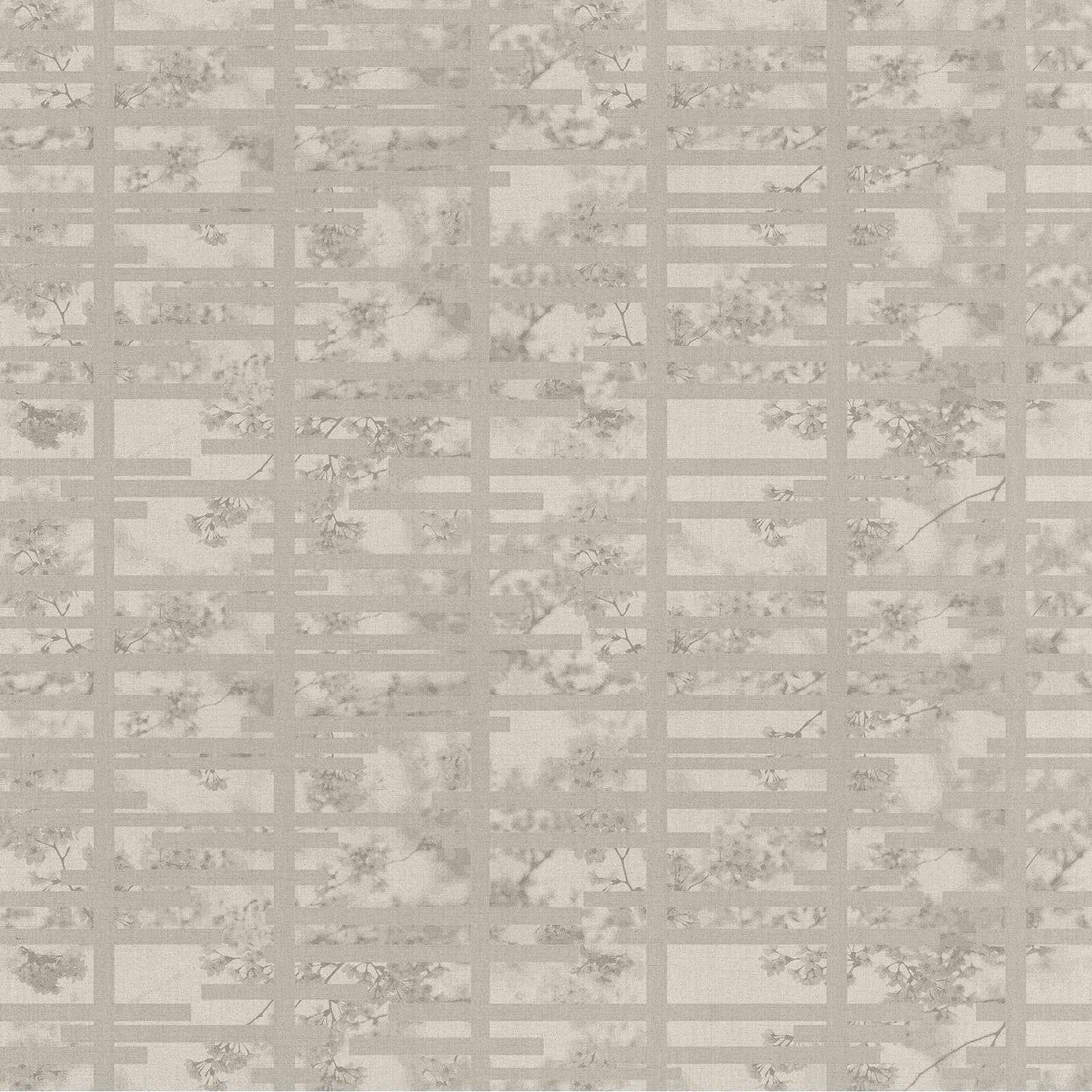 A wallcovering decorated with an abstract and stylised drawing of a Japanese garden in spring, with cherry blossoms combined with rigorous architecture to express a blend of East and West. It is made on a nonwoven fabric with metal laminate that gives the product special pearlescent effects.