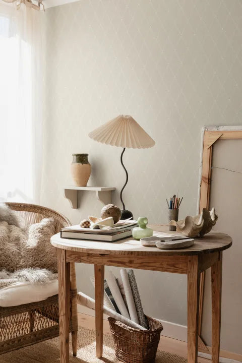 Wallpaper Gabriel grey is an elegant rhombus with gold dots, Gabriel fits well with our striped Gustav pattern, and is great for beautiful walls in a dining room or living room.