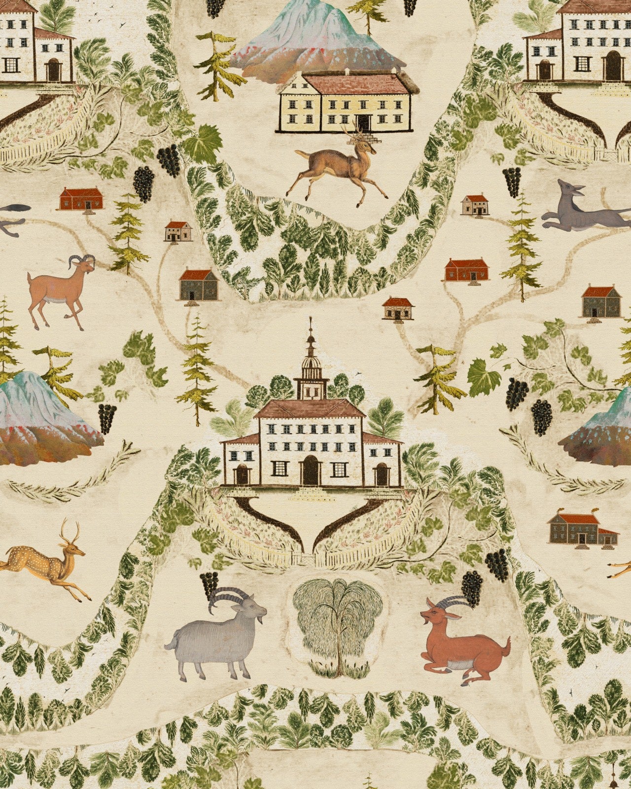 In the upper Paznaun valley in the Austrian state of Tyrol lies Galtür, a picturesque village where mountain life is at the very heart of its culture. Inspirated by the authentic local lifestyle, GALTÜR OF TYROL takes that alpine landscape along with traditional architecture and characterful deer and goats to create a delicate whimsy wallpaper that’s almost map-like in its execution.