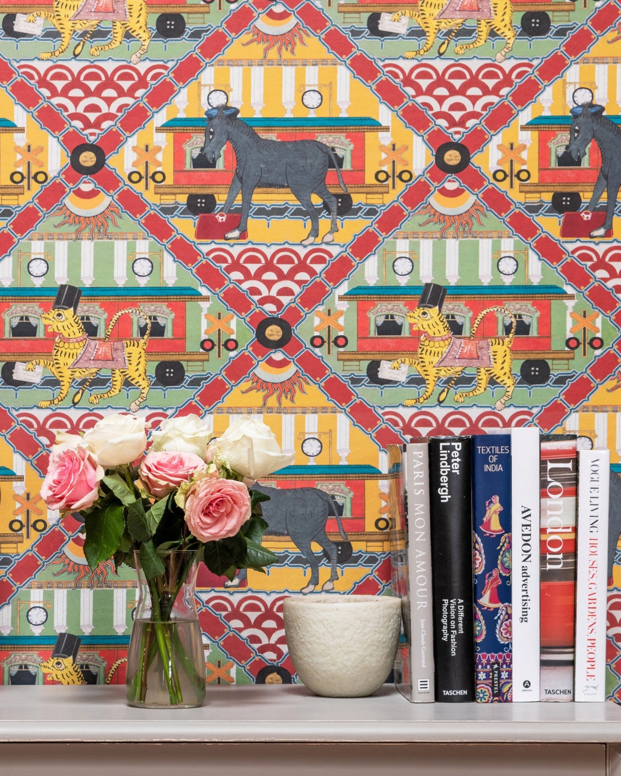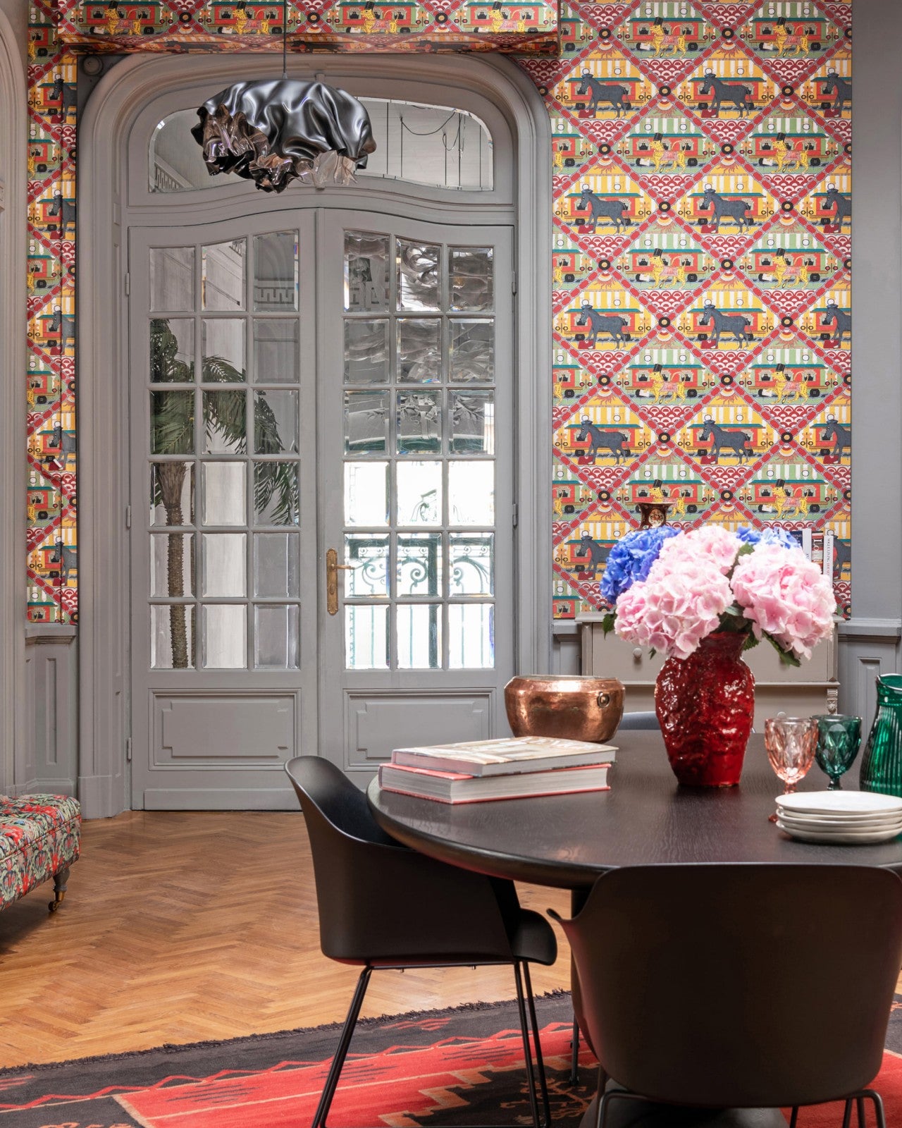 As the train pulls into the station, its dynamic energy shifts the mood of guests to one of excitement and anticipation as enchanting creatures parade down the platform in a striking spectacle against the grandeur of the neoclassical architecture of GARE DU NORD. Patterns and colours come together in a dazzling display bringing vivacity into the home, as the ornate beauty of the carriage itself takes centre stage. A bold and animated print that sparks interest and imagination each time you peruse it.