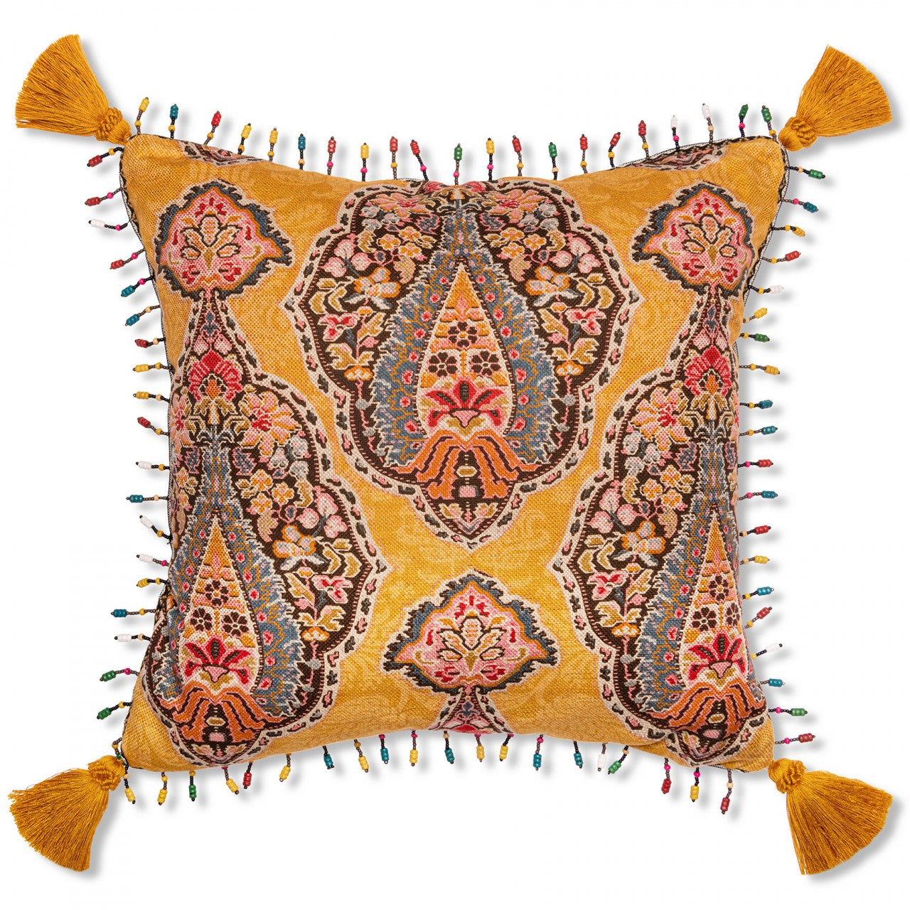 Exuding the vibrancy of the Woodstock era and the festival atmosphere, this printed linen GYPSY SOUL cushion will lift your spirits bringing joy to the home. Complete with matching corner trimmings, the cushion also has smaller multi-coloured beaded tassels creating a unique fringe detail.