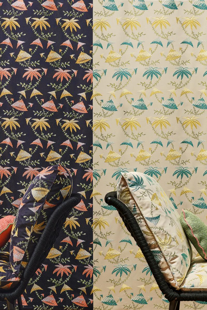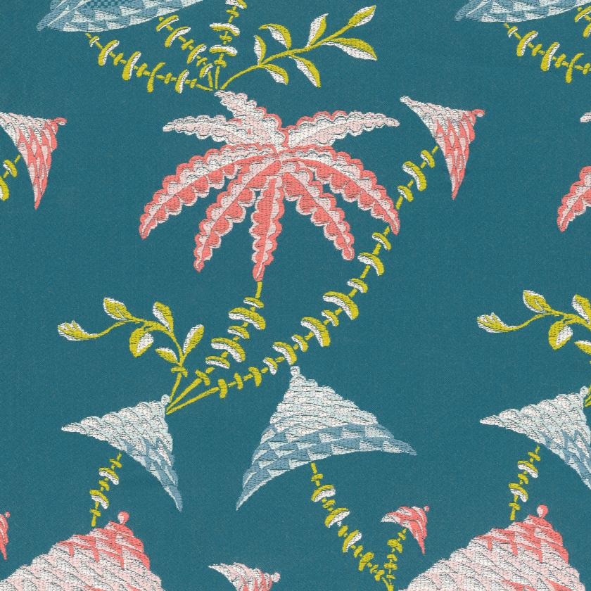 This jacquard, taken from a rather bizarre design dating back to the 18th century and conserved in the archives of Fondazione Rubelli, is an invention. Its design, so rich it looks like embroidery, evokes a fantastic journey into a utopian world. Suitable for intensive use.