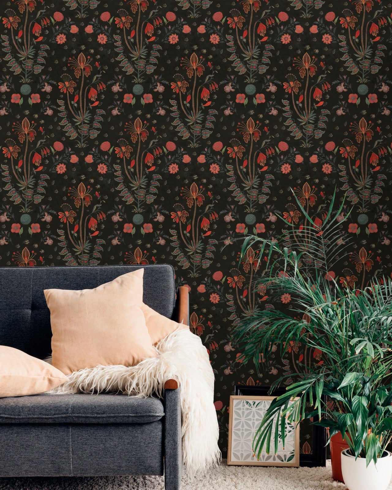 Fantastically detailed and mesmerizing in colors, this bohemian designer wallpaper displays loads of florals and folk motifs. True to the nomad character that exudes through bright colors and intricate patterns, the GYPSY Wallpaper will enrich the energy of any room. Luminous tones of reds, orange and purple blossom in delicate flowers, as shades of green add a natural and fresh contour to the entire canvas.