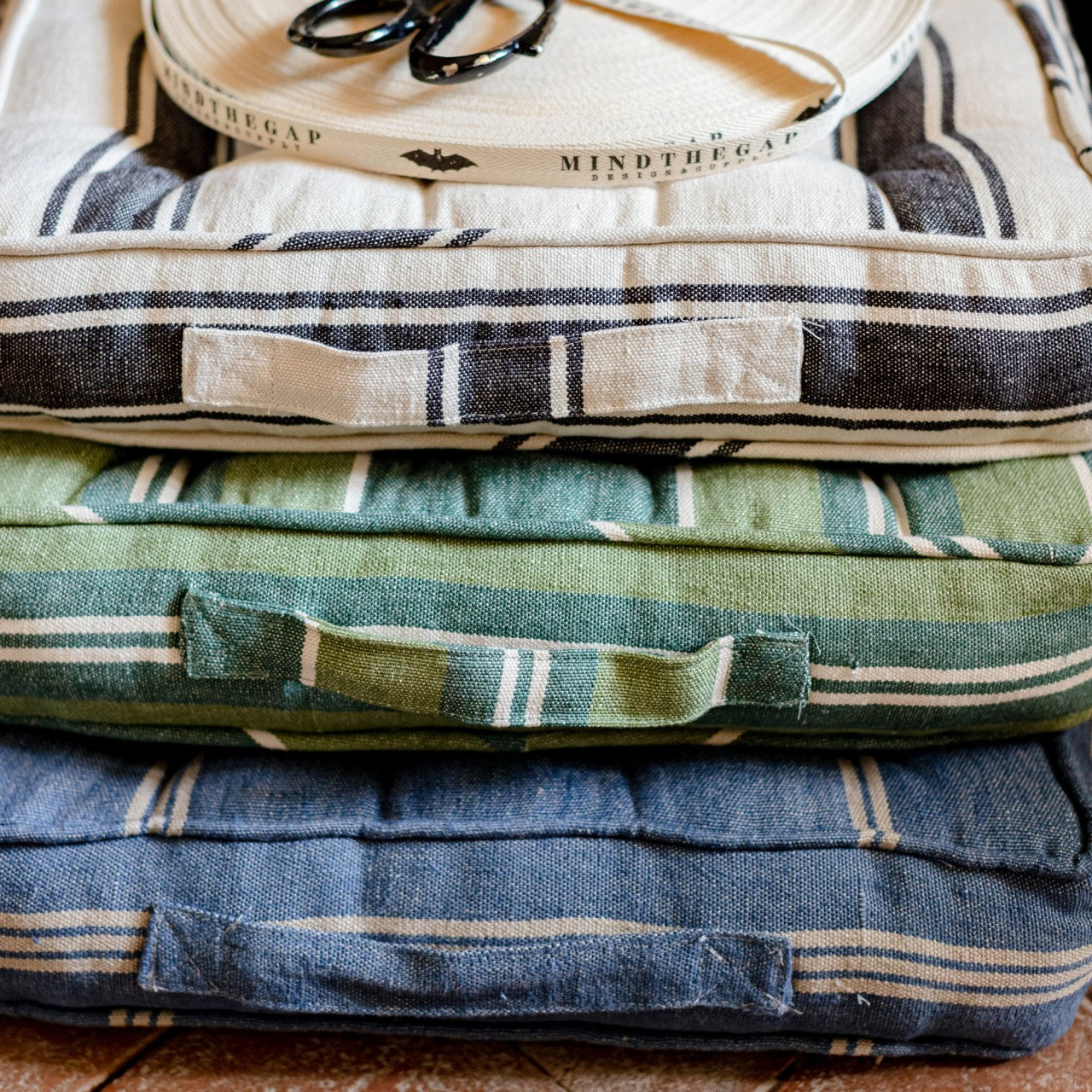 Revamp your dining chairs with our stylish and comfortable new padded cushions. Made of woven natural linen, the HAJDU STRIPE linen chair cushion is hand sewn and finished with a piped edge that matches the fabric. Filled with thick poly foam insert with polyester cove, each cushion is decorated with a beautiful linen handle.