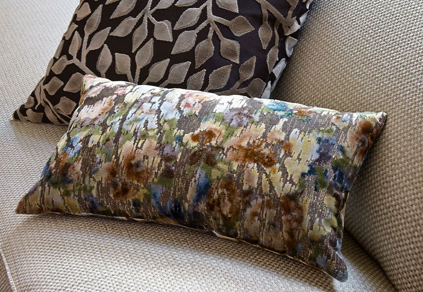 Hana pairs an abstract floral jacquard with a velvet pile for dramatic texture and depth. Ideal for statement upholstery pieces that demand elegance.
