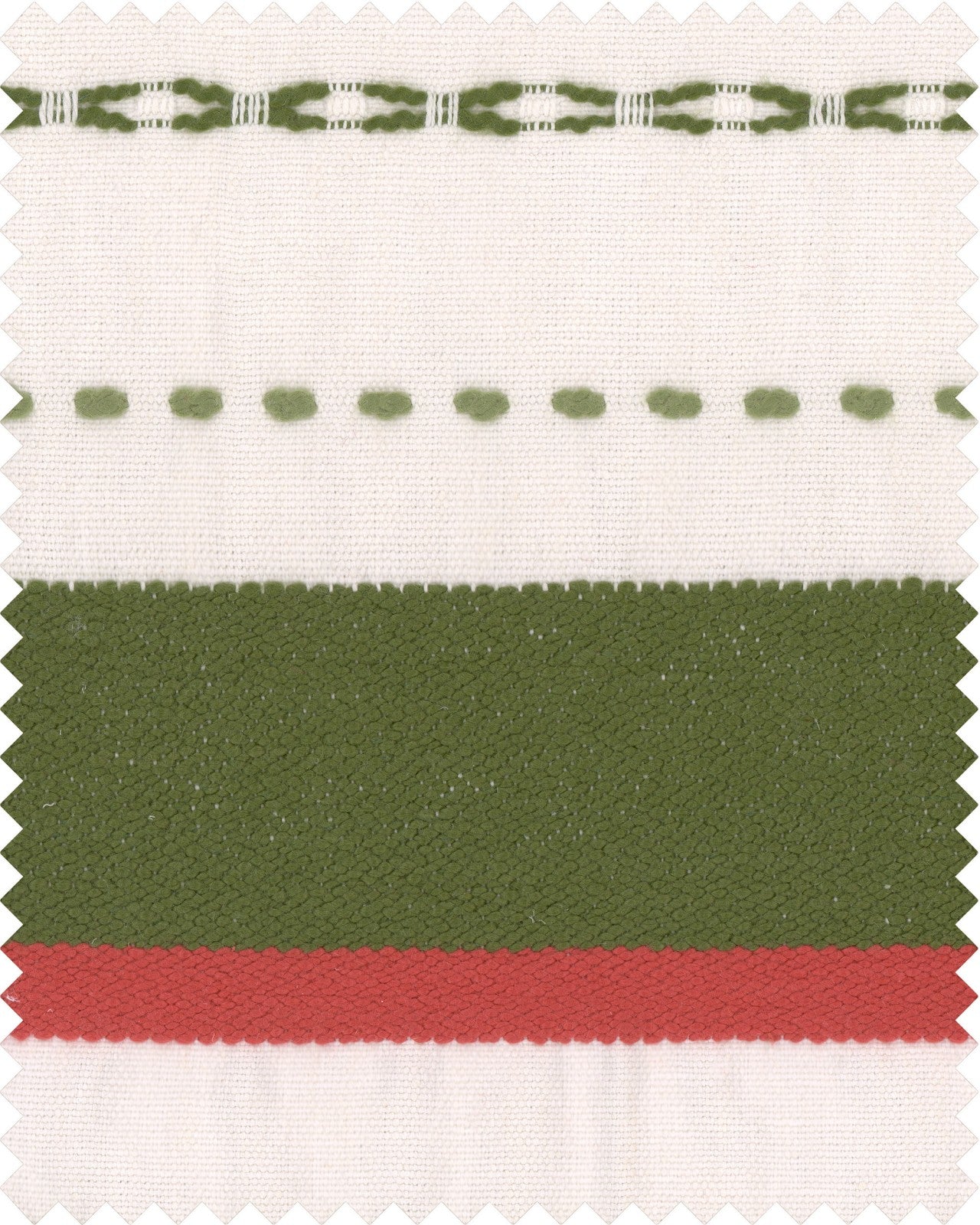 Fresh and pretty, HANDWERKLICH is a linen/cotton that emulates the feel of a hand embroidered fabric. Combining a gentle moss green with a cheerful cherry red, the result is a joyful, striped design that pays homage to classic Tyrolean textiles.