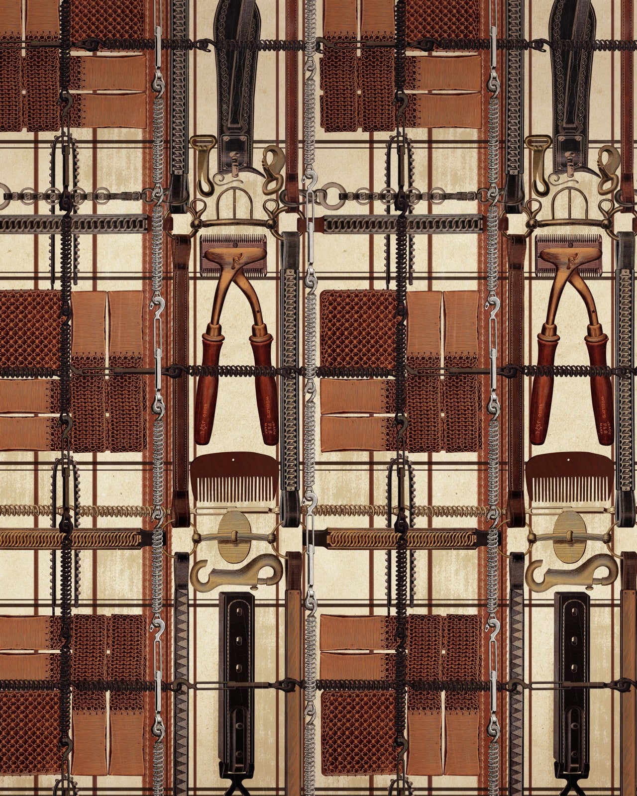 An equine take on a classic tartan-like print, HARNESSMAKER’s ATELIER sees stable accessories and tools put on the most artful of displays. Forget about practicalities, this pattern is all about embracing the beauty in the everyday and finding joy in simple things. Combs, hooks, straps and tools of every shape and size come together to form an abstract checked pattern, each piece carefully drawn in an illustrative true to life style to be found in the atelier of a harnessmaker. Leathery blocks of colour contrast with antique white patches are decorated with subtle metallic tones – opt for a dark navy background for a cosy, intimate feel, or the paler off-white background, which accentuates each individual item.