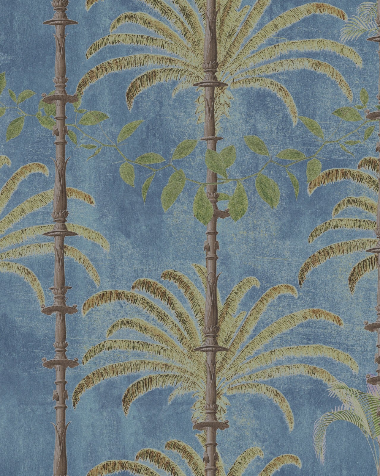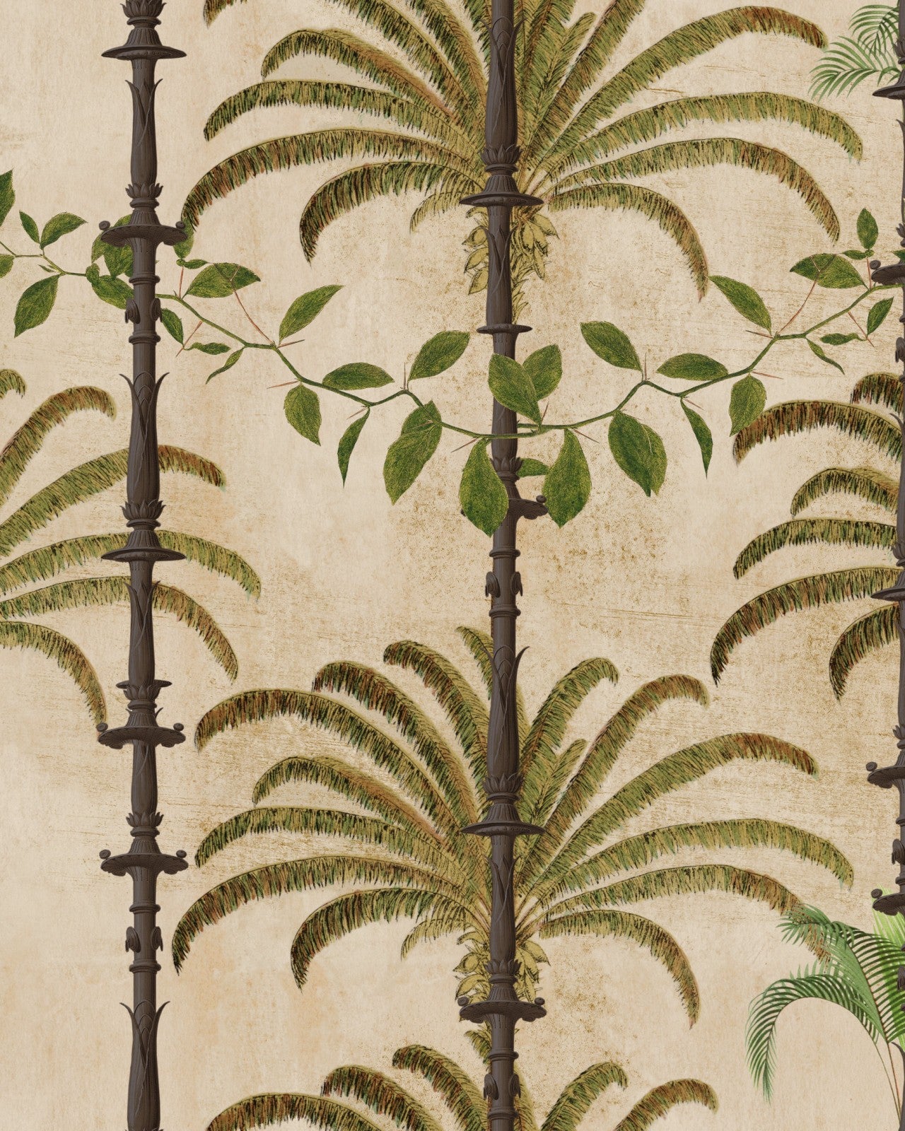 A stylish tropical wallpaper, inspired by the streets of Havana and the chill lifestyle of Cuban people. Featuring large illustrated Cuban palms and typical ornamented colonnades, this design is the perfect choice for colonial or tropical inspired interiors.