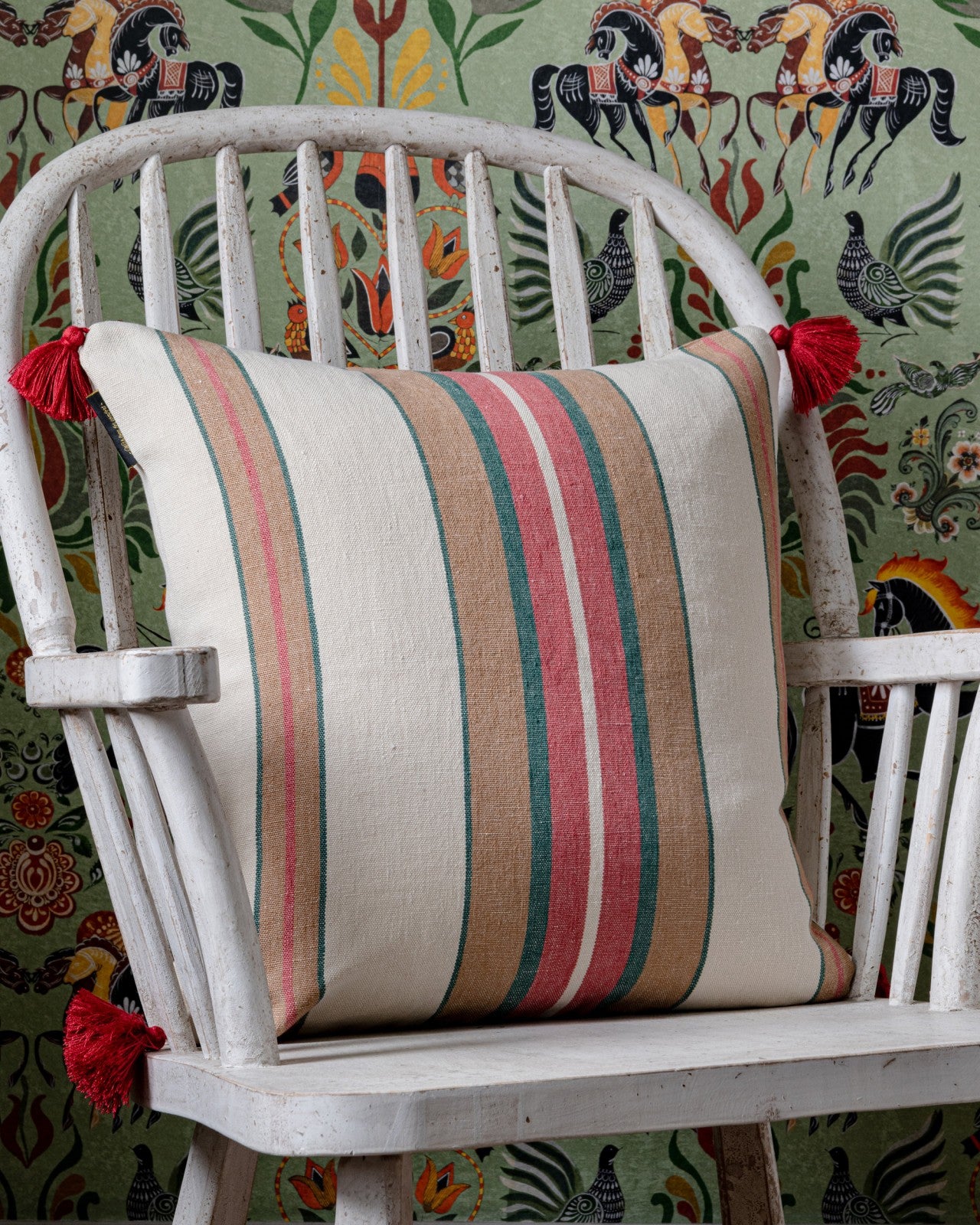 Inspired by the evangelical church in Herina, Transylvania, this bountiful woven heavy linen fabric has late Romanesque influences, displayed through a delicate colour palette and the mixed different stripes. An excellent complementary fabric made of heavy linen stonewashed for more softness.