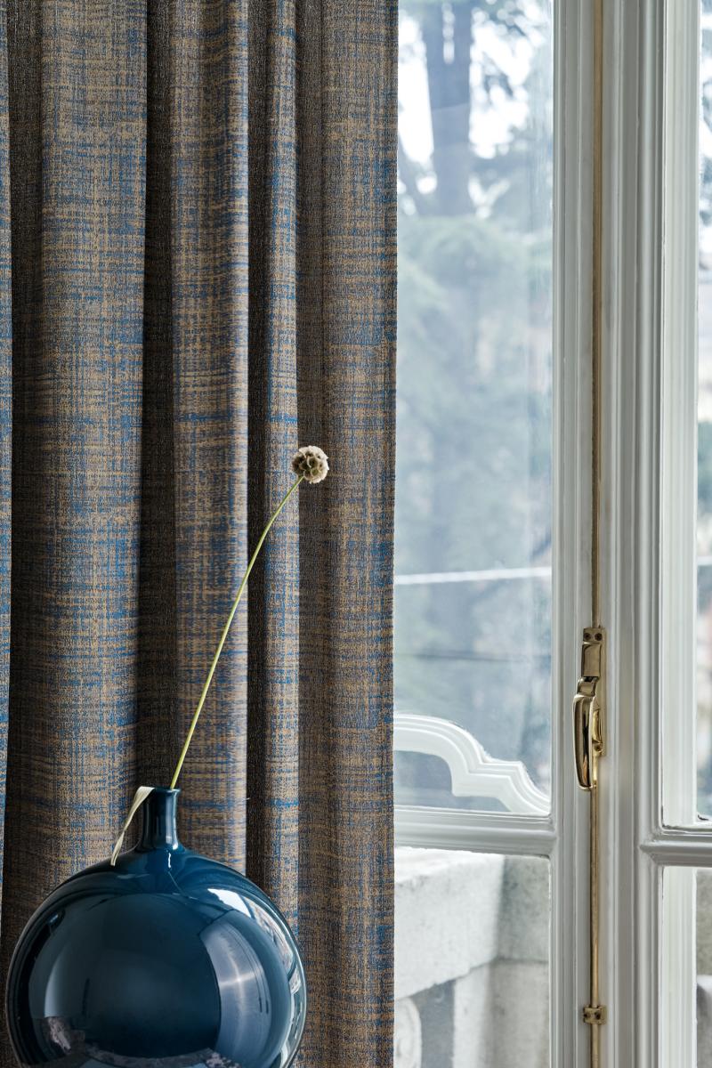 Flame retardant curtain in Trevira CS, in double width. Full-bodied and opaque, it is highly decorative with its tartan pattern. Available in 8 versions – natural and gold tones, aqua, blue, lacquer.
