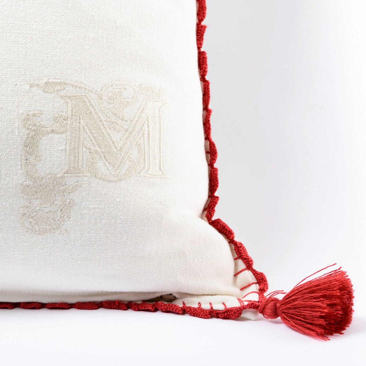 The true Hungarian-green folk horse pattern is a staple for the Transylvanian roots. Having a statement green embroidery on front and a white M letter monogram on the back, the linen cushion is hand-finished with red scallop crochet lace trimming and red cotton tassels. It comes with 100% duck feathers filling.