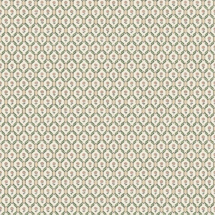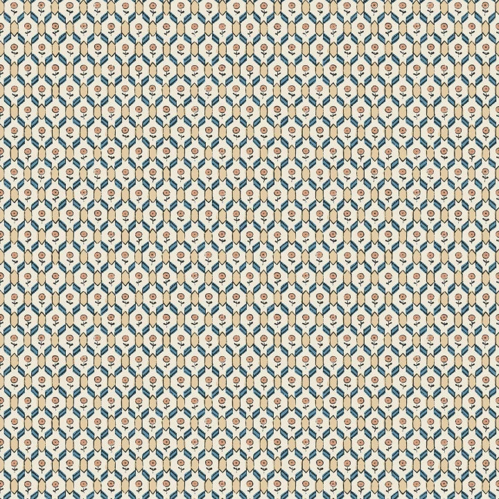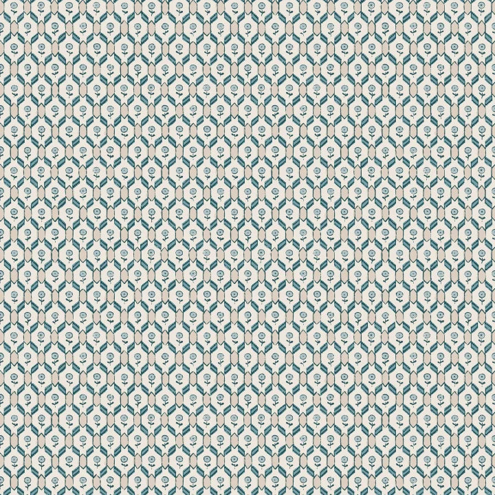 This hand painted Domino design was once the cover of a French book about the discovery of America published in 1781. The simple floral and geometric pattern evokes cherished memories of an old paper-lined dresser in a French country kitchen. This Hugo wallpaper has the colorway misty blue.